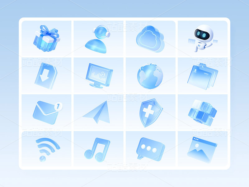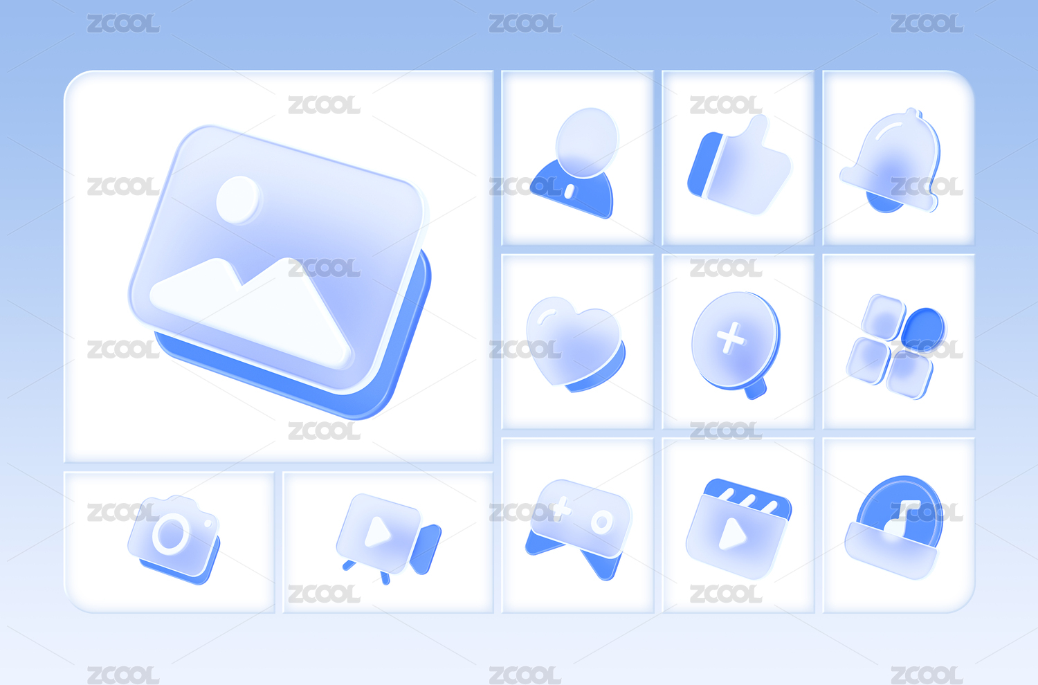 蓝白色透明磨砂玻璃娱乐3D图标合集