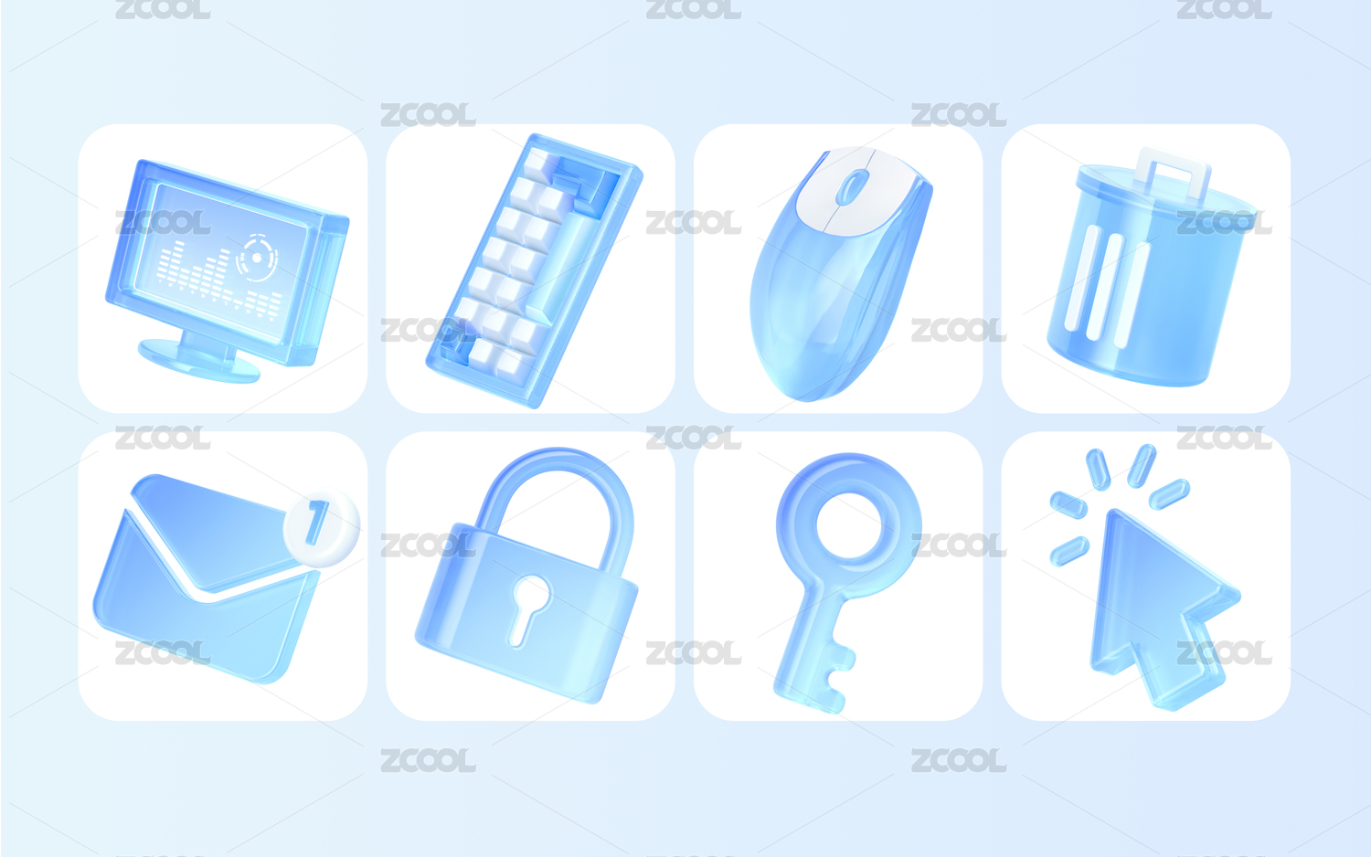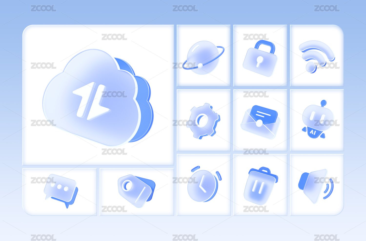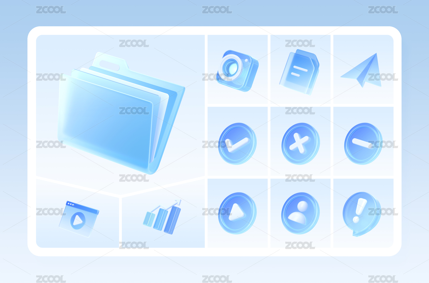 蓝白浅色透明磨砂毛玻璃企业办公图标合集