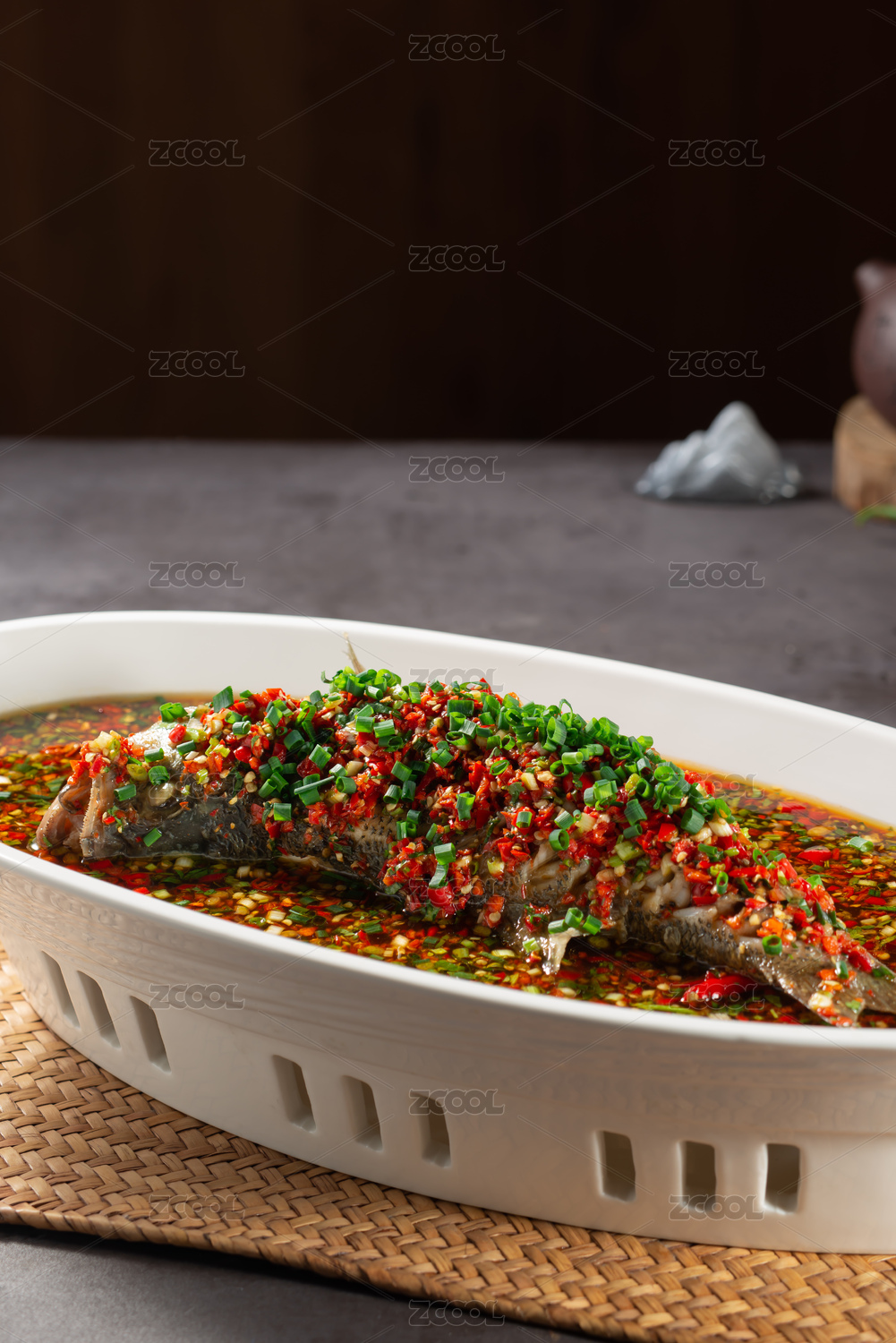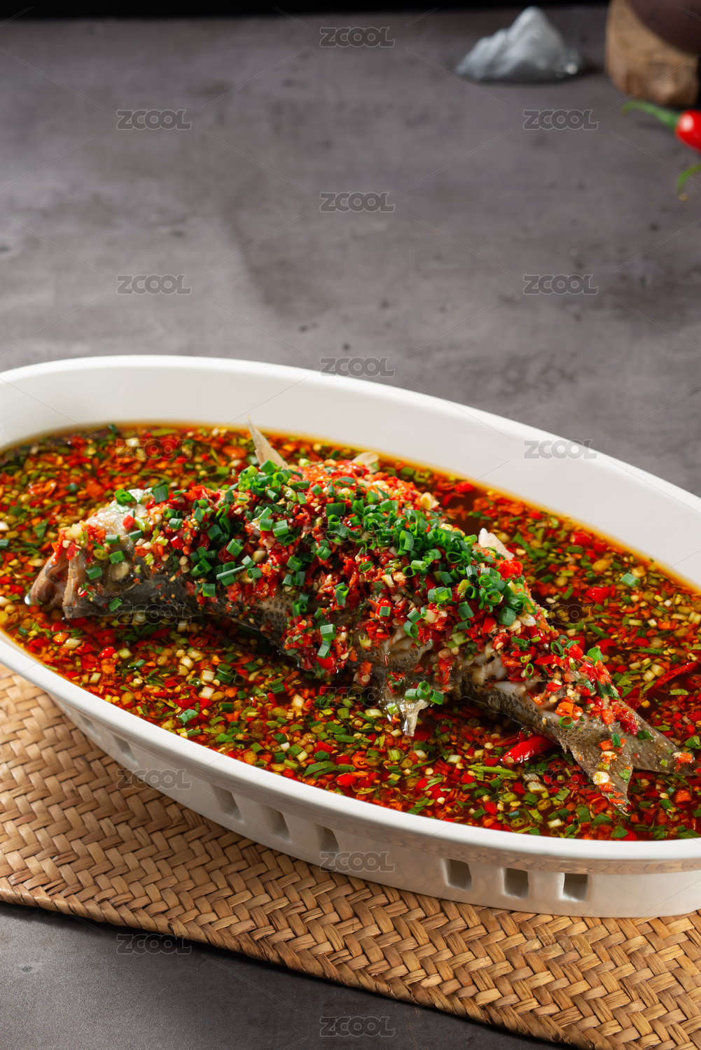 炊具,膳食,成分,舒适的食物,一盆,清蒸,油泼,泡椒,香葱,大鲤鱼