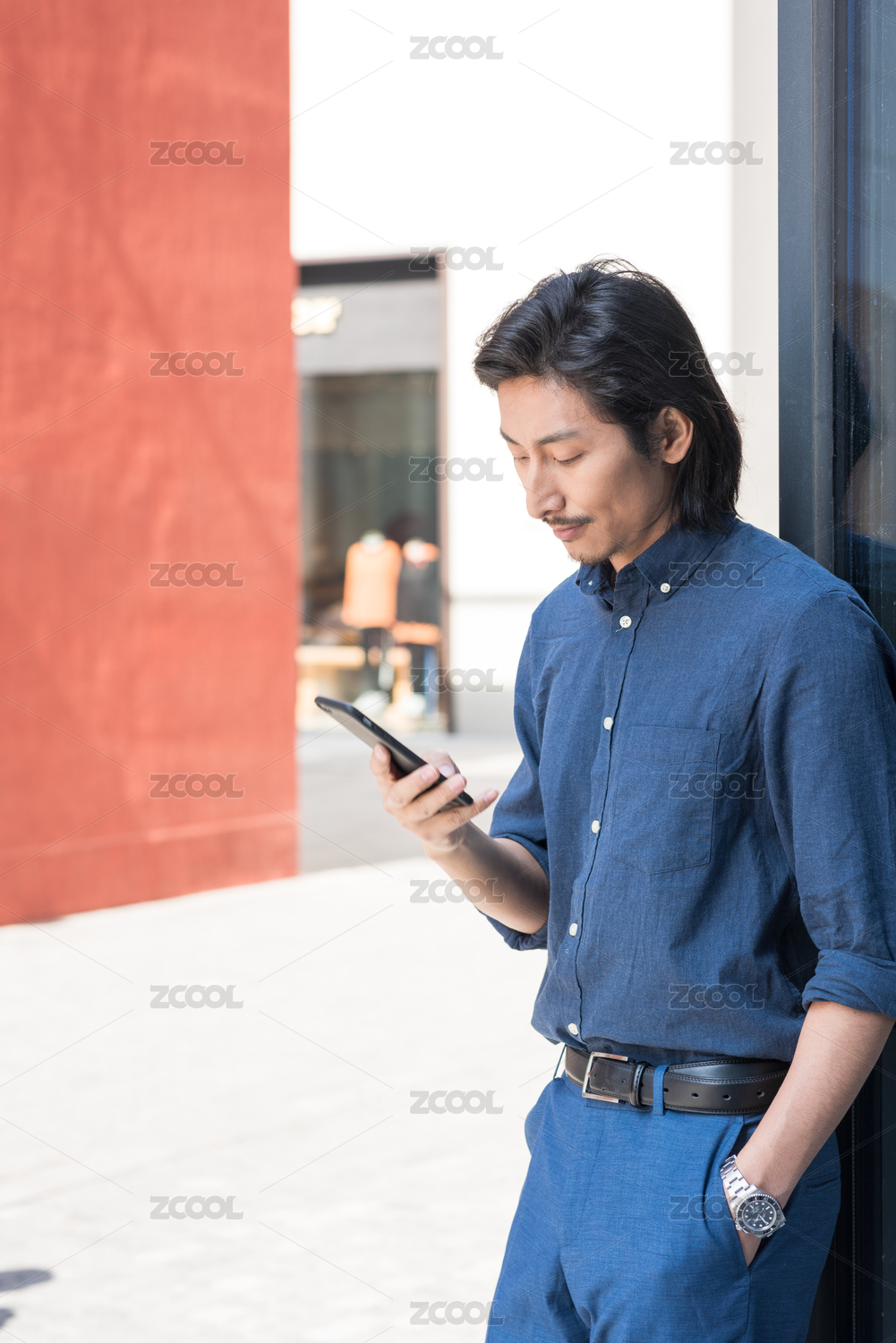 年轻帅气的商务男士在写字楼前看着手机屏幕