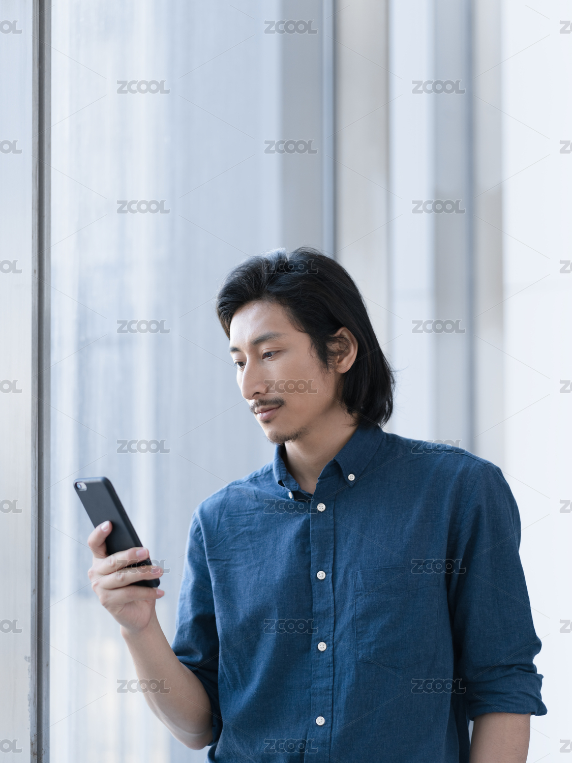 亚裔商务男士在写字楼玻璃窗旁使用手机