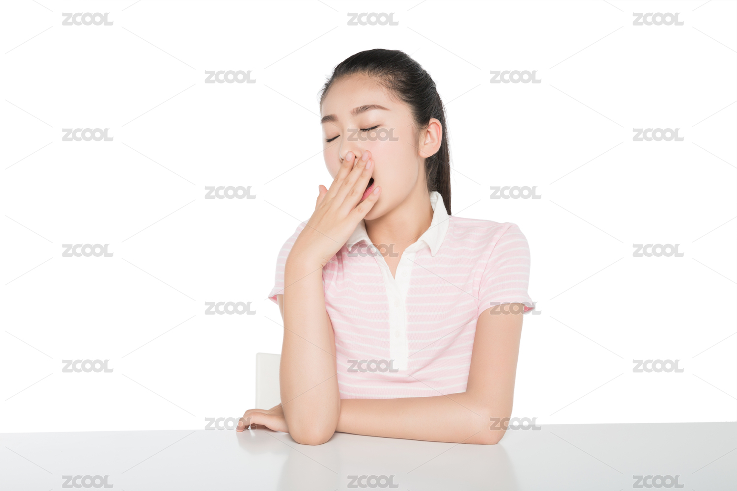 白色背景下一个中国人因为过度劳累而打哈切伸懒腰犯困