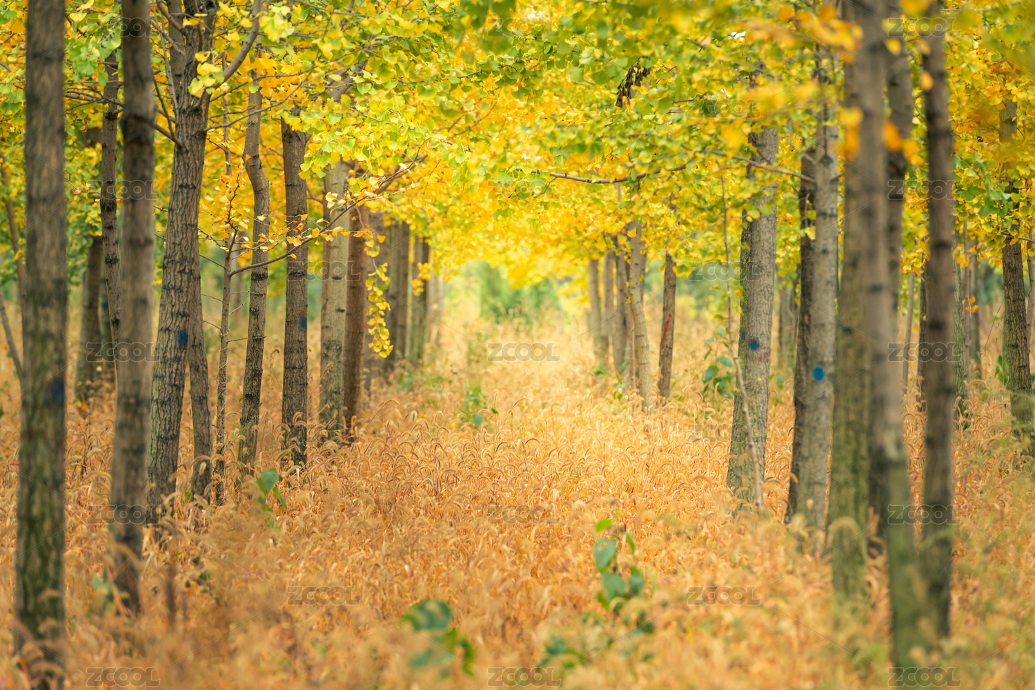 阳光穿透银杏林照射在铺满金黄色落叶的地面上