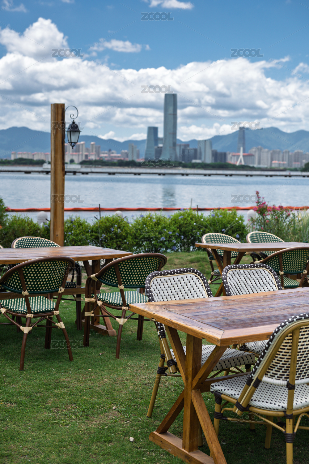 中国深圳南澳海贝湾午后阳光下的海景餐厅