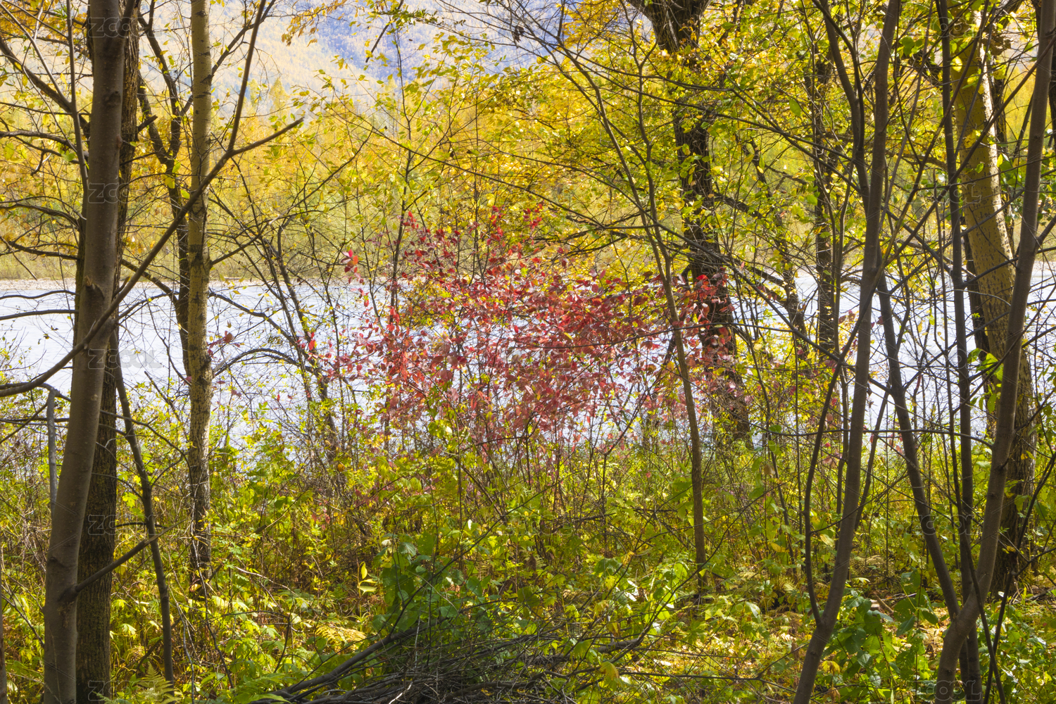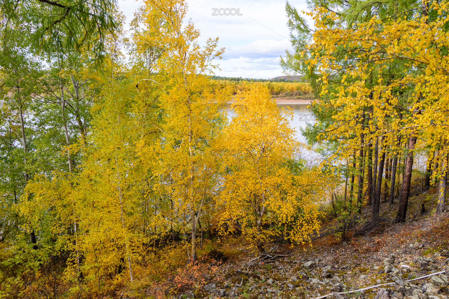 树,彩色,叶子,红叶,霜叶,倒,曲线,中国,大兴安岭,河边