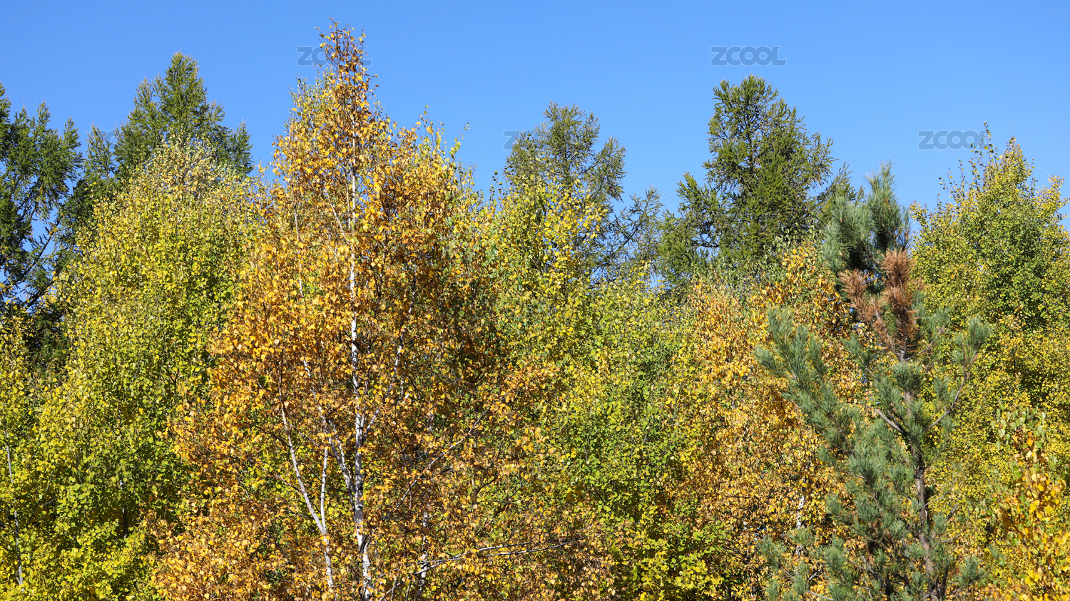 蓝天下秋天森林里金黄色树木树叶的自然风景