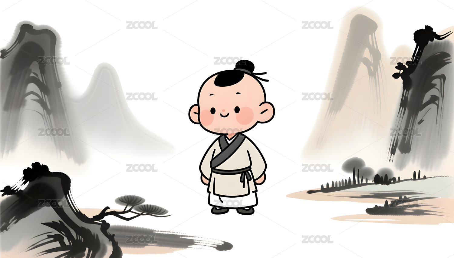 线条卡通插画一位诗人对着高山瀑布吟诗
