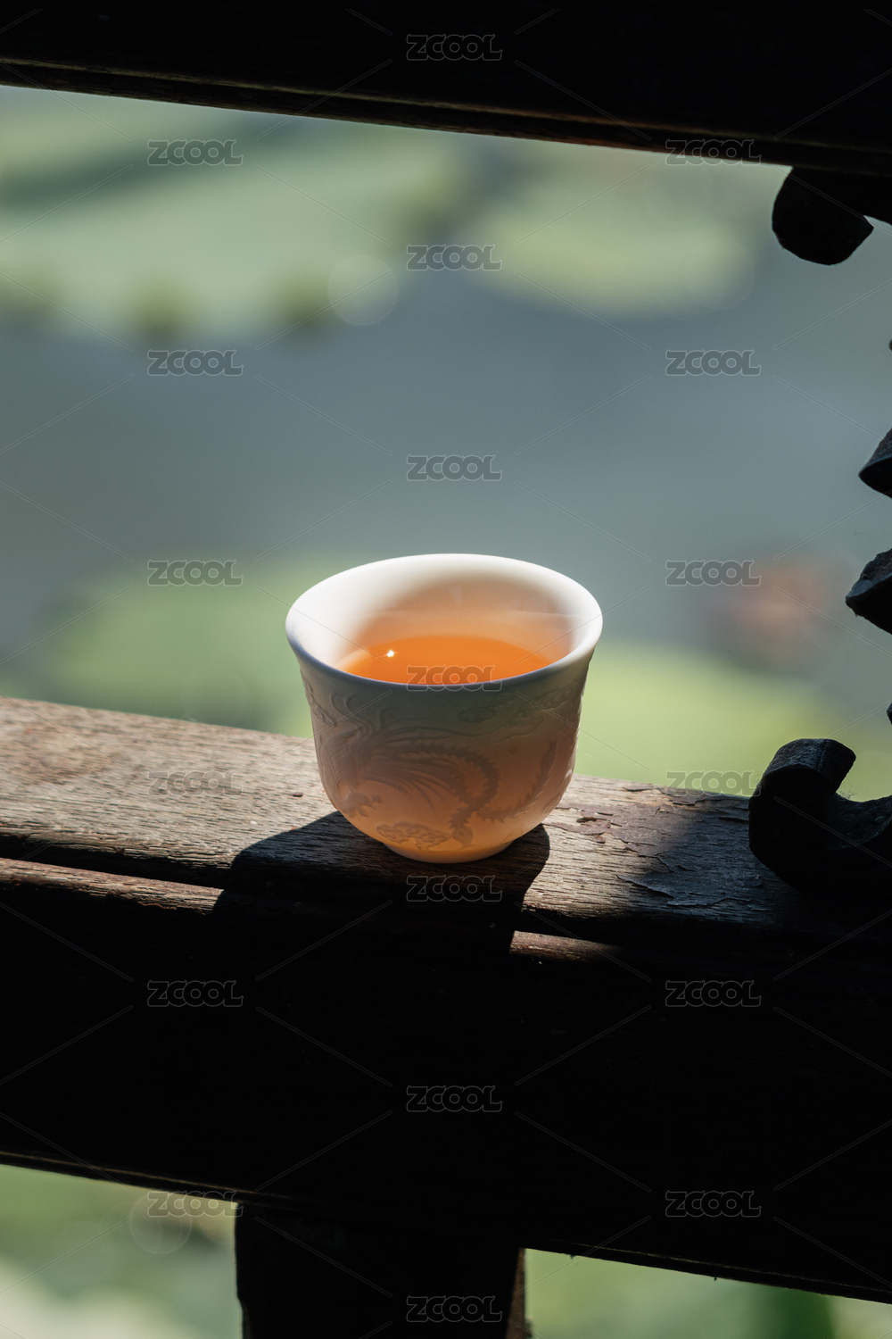 池塘荷叶背景中亭子栏杆上的一杯红茶