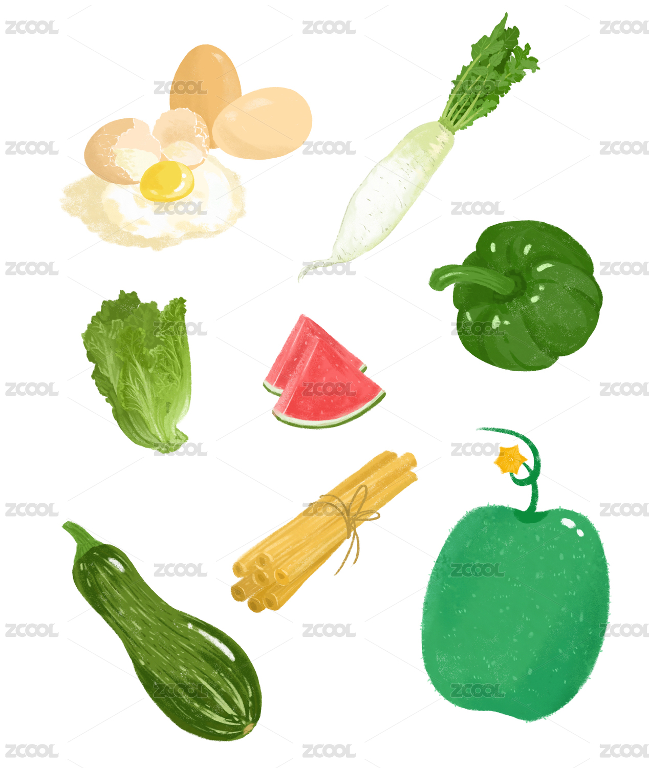 手绘蔬菜水果插画萝卜生菜南瓜西瓜鸡蛋青椒