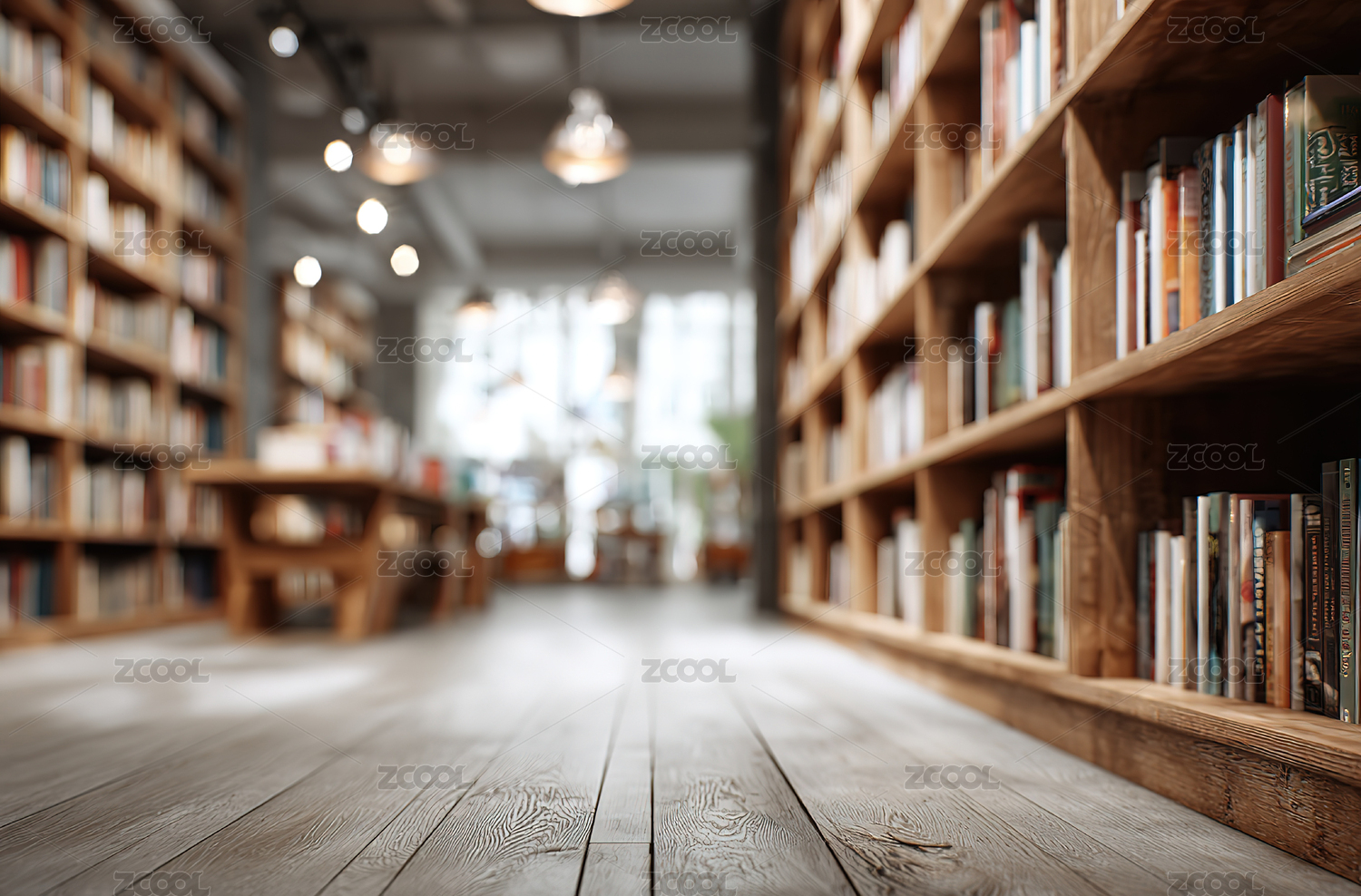 宽敞的图书馆里排列着整齐的书架虚焦