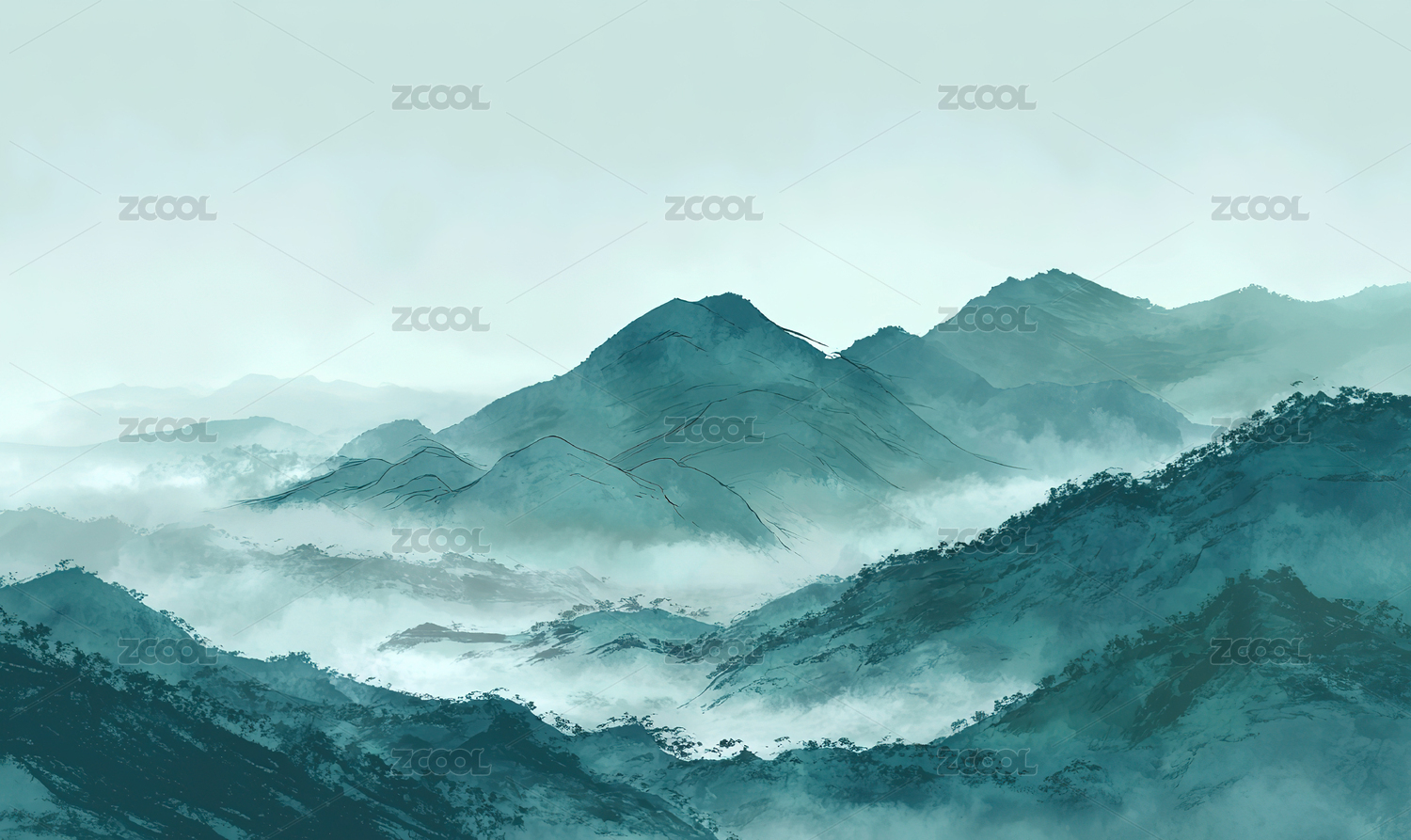 云雾缭绕新中式山水墨画背景插画