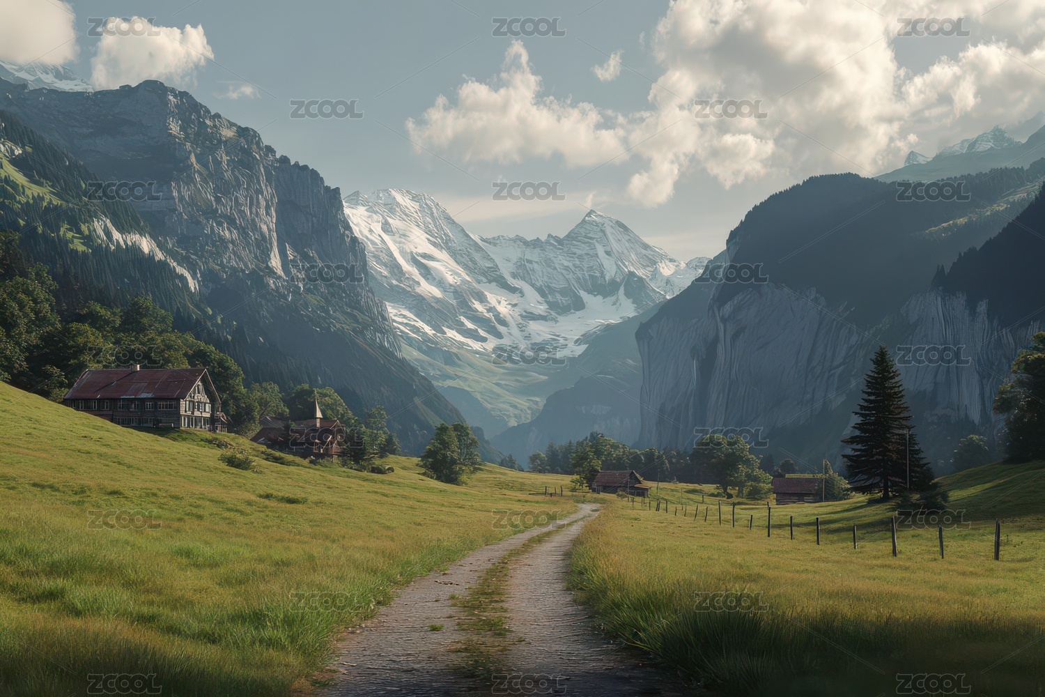 清晨云雾缭绕的瑞士梦幻山坡:木屋和雪山