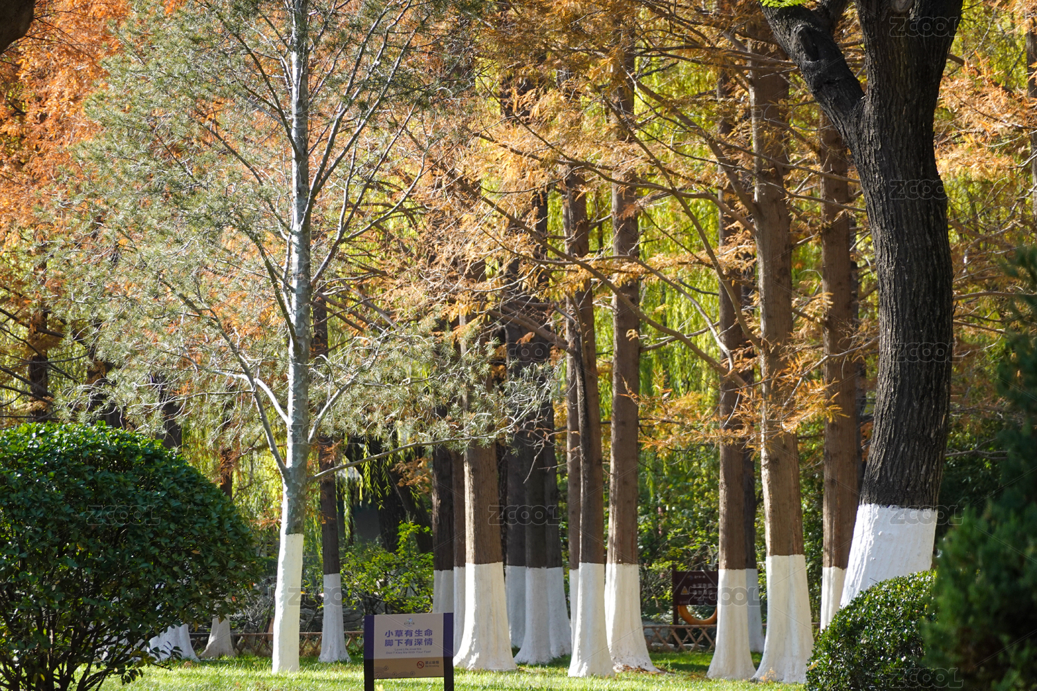 明媚的阳光照射到公园的草地上,草地上树木茂盛,在晴朗的夏天