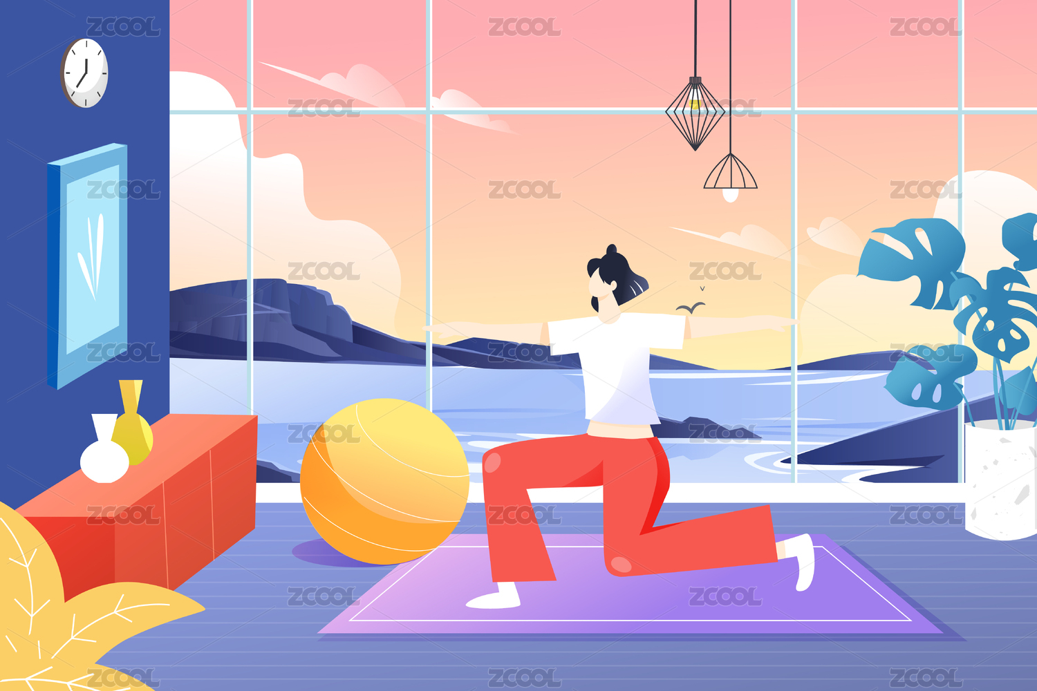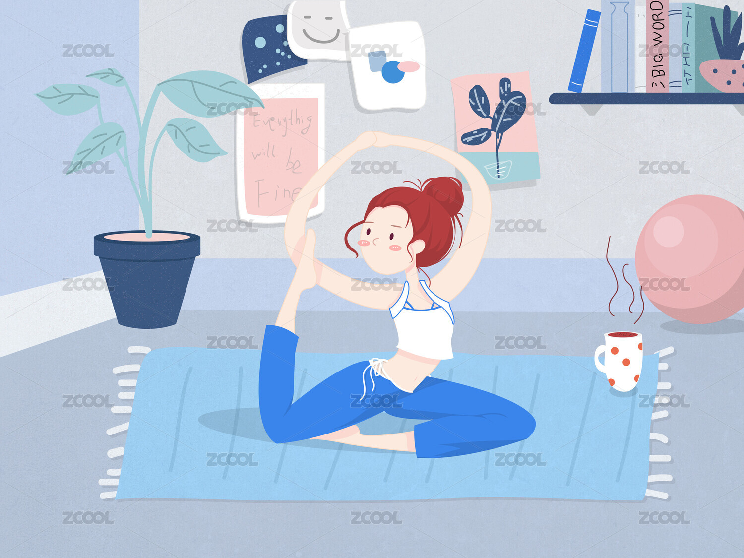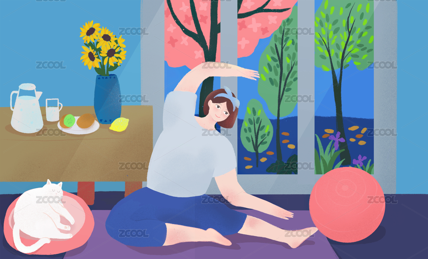 夏天女孩健身减肥瑜伽锻炼教练直播跳操插画