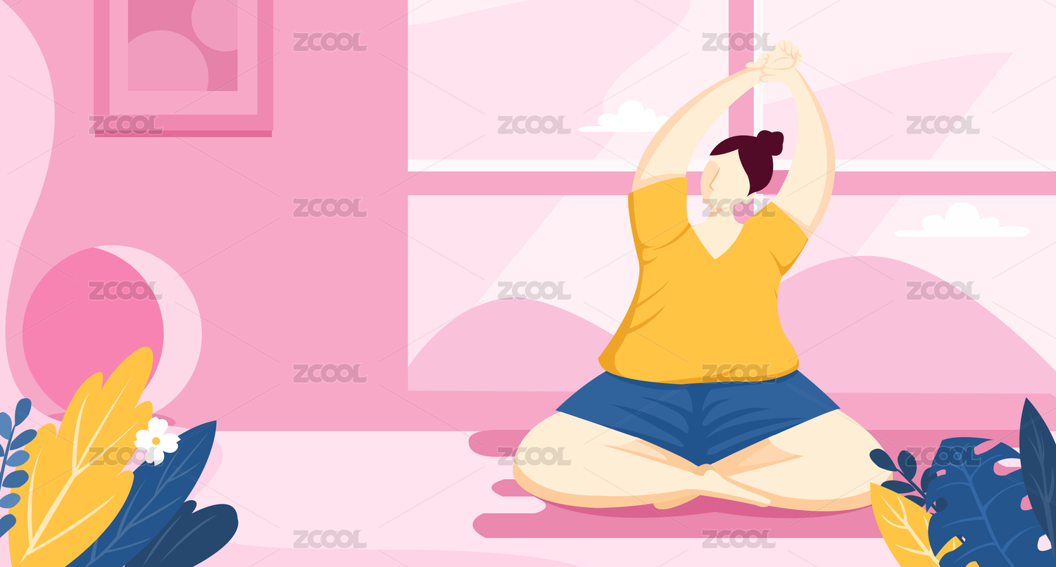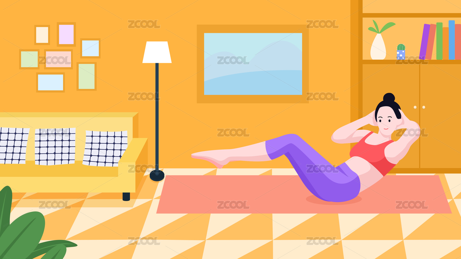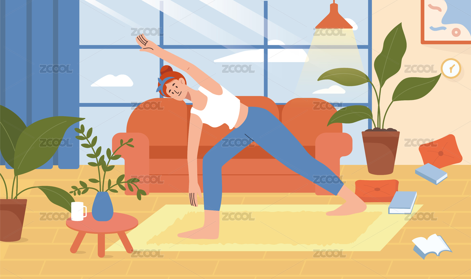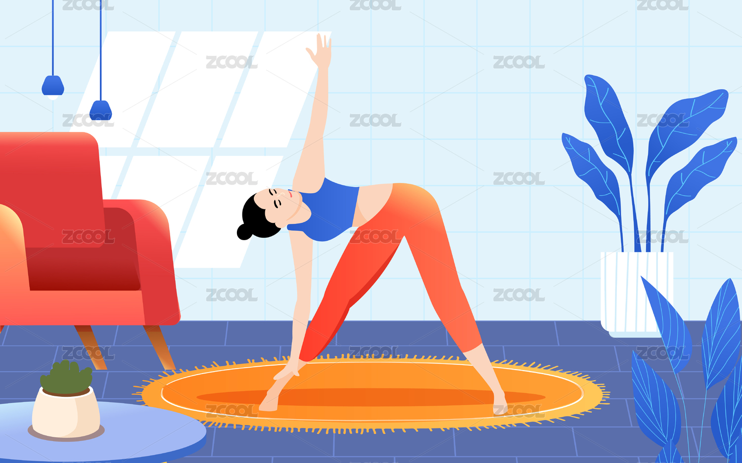 夏天女孩健身减肥瑜伽锻炼教练直播跳操插画