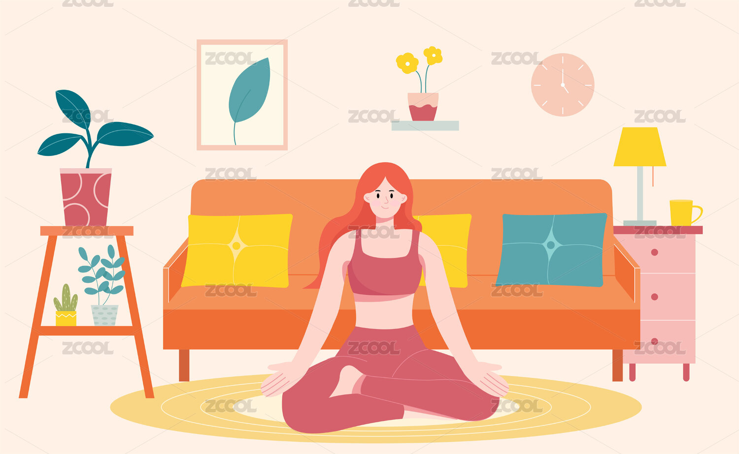 女孩居家隔离瑜伽锻炼健身分层矢量插画