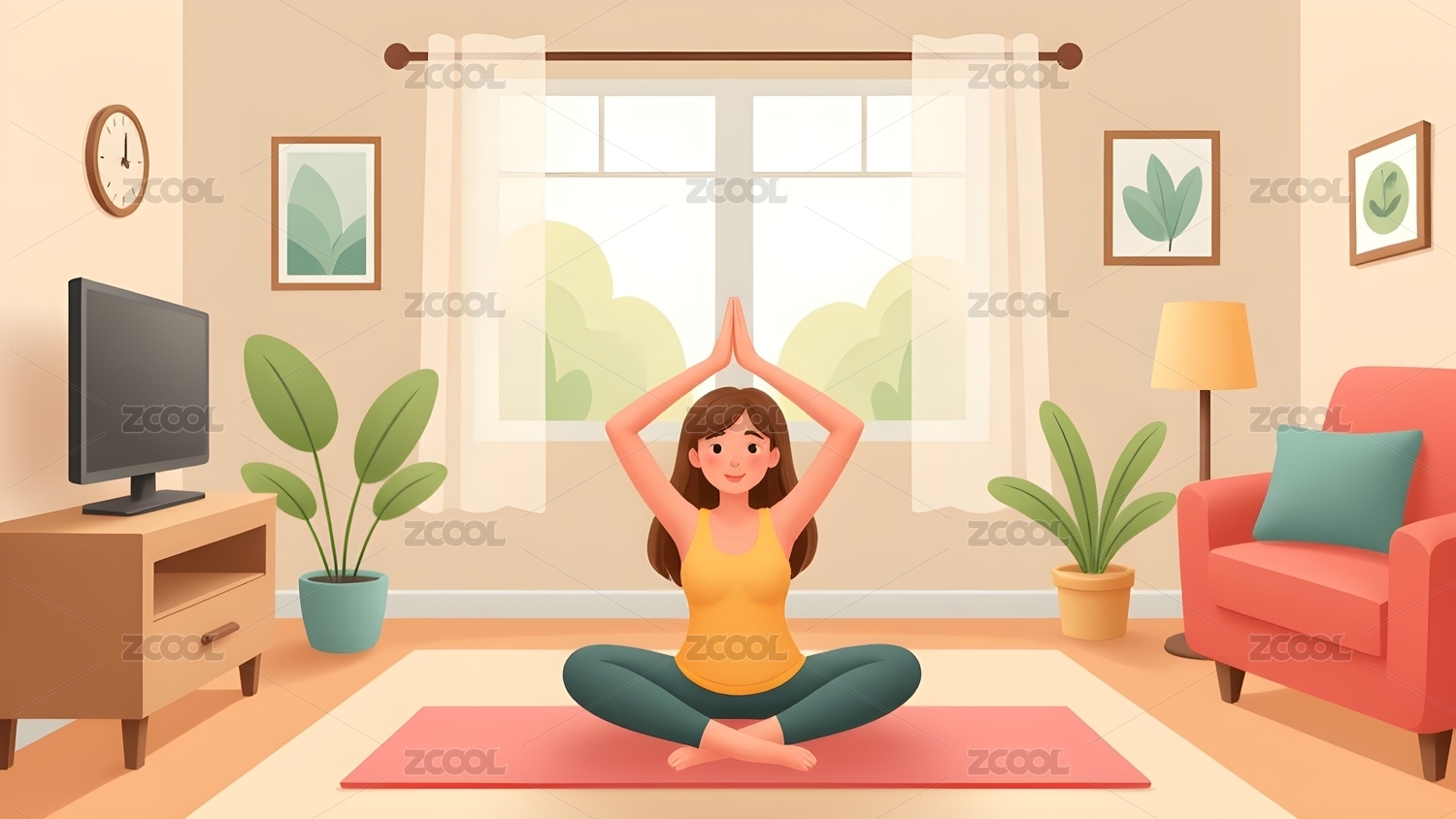 春天阳光明媚女孩在室内做瑜伽扁平插画