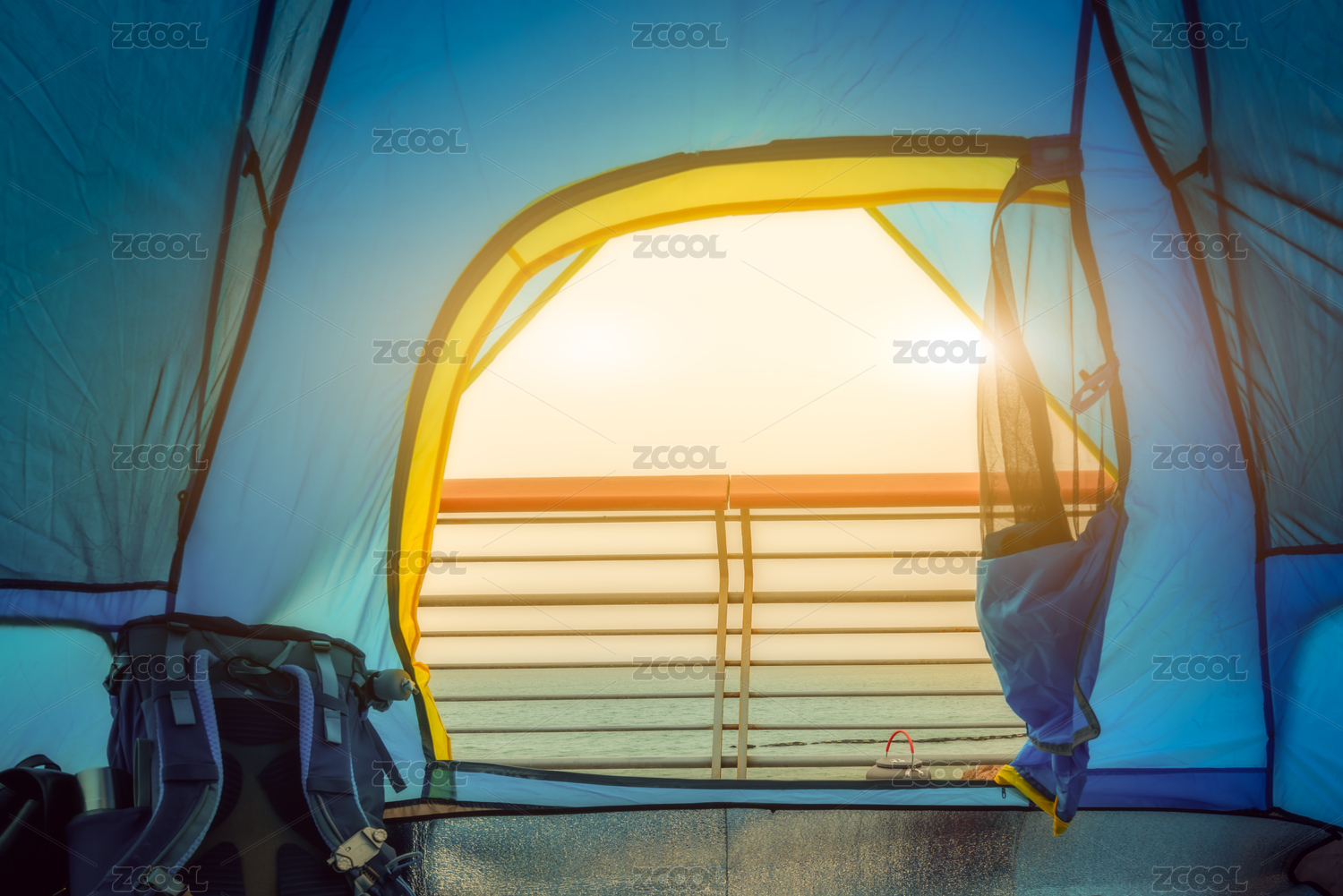 在山的顶部,夕阳的天空户外帐篷丰富多彩