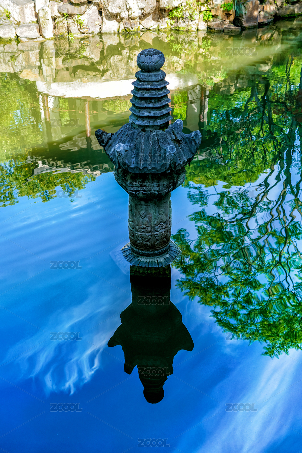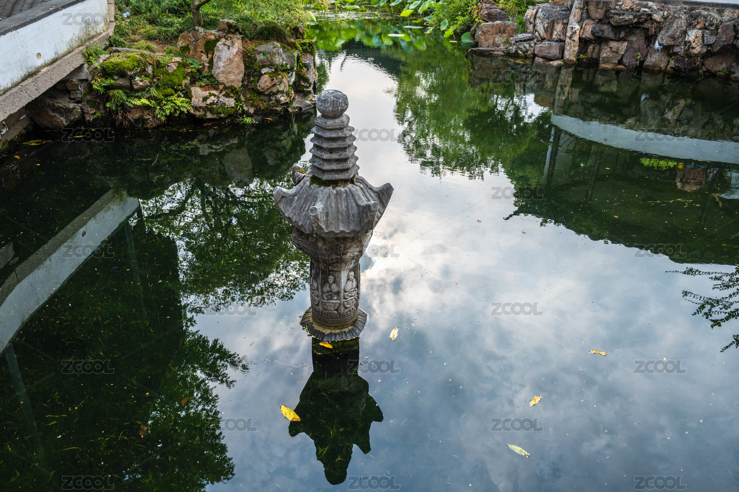 江苏拙政园苏州园林水中石塔倒影与谁同坐轩