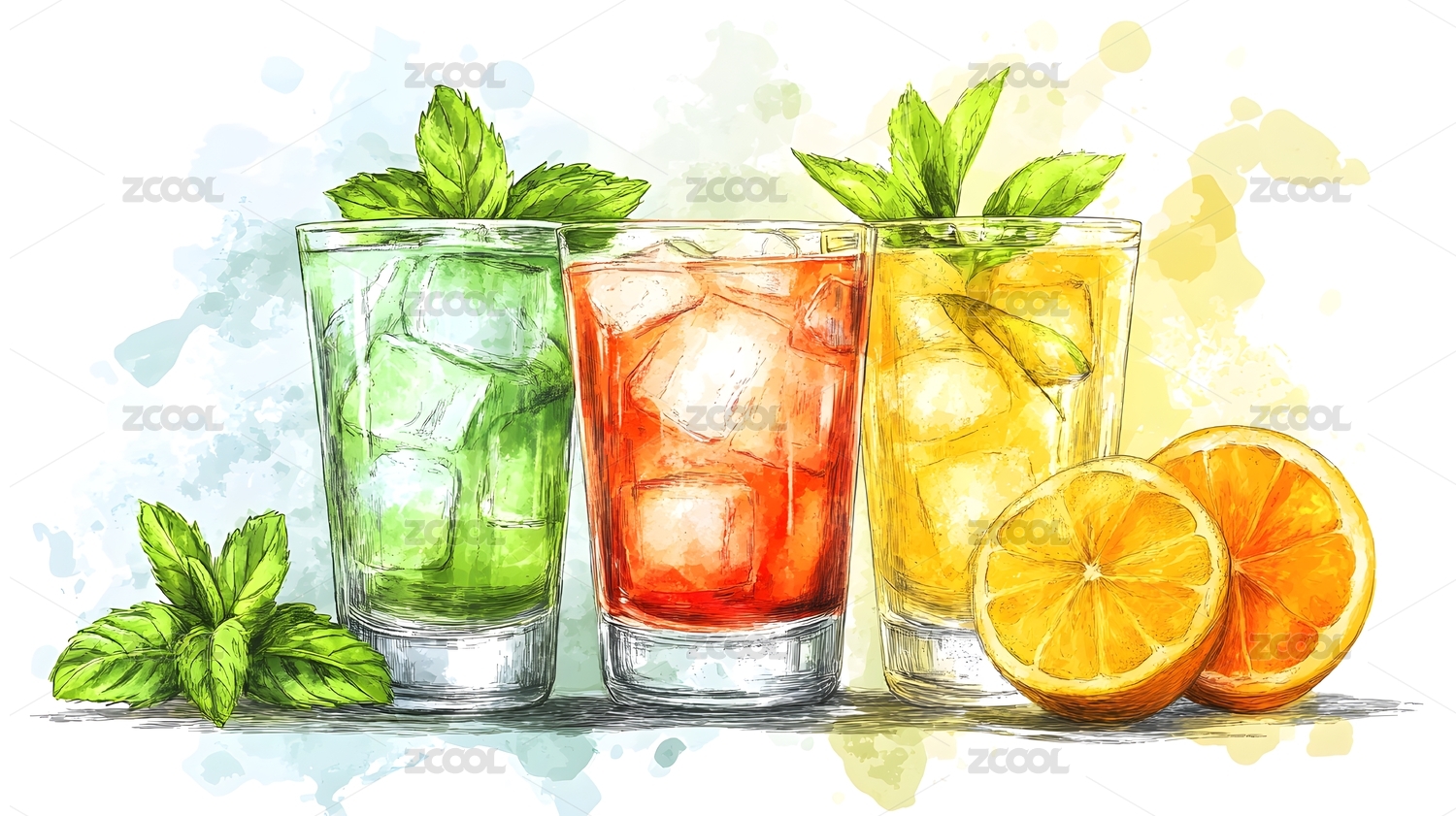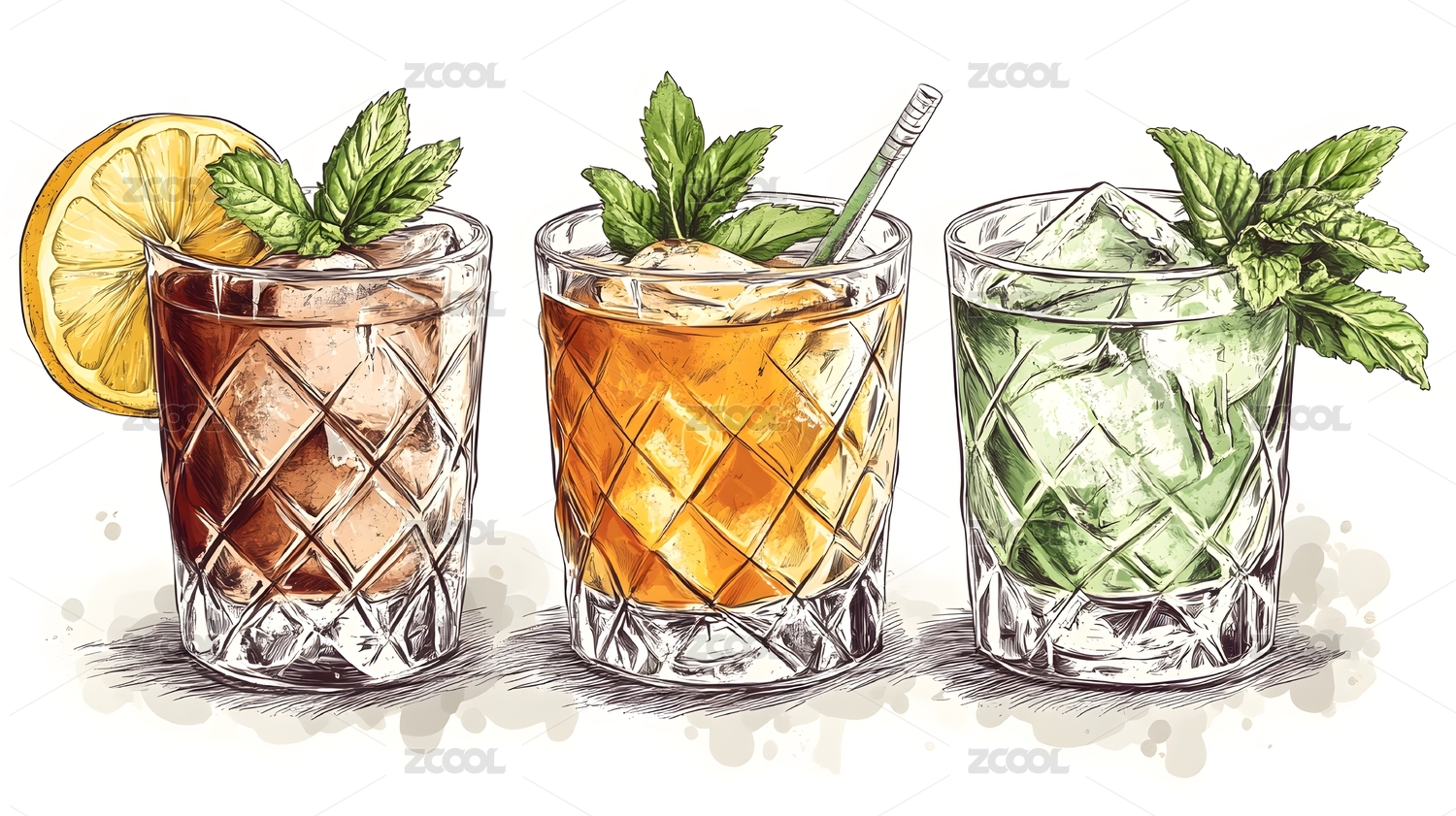三杯鸡尾酒与柠檬薄荷的精美手绘插画