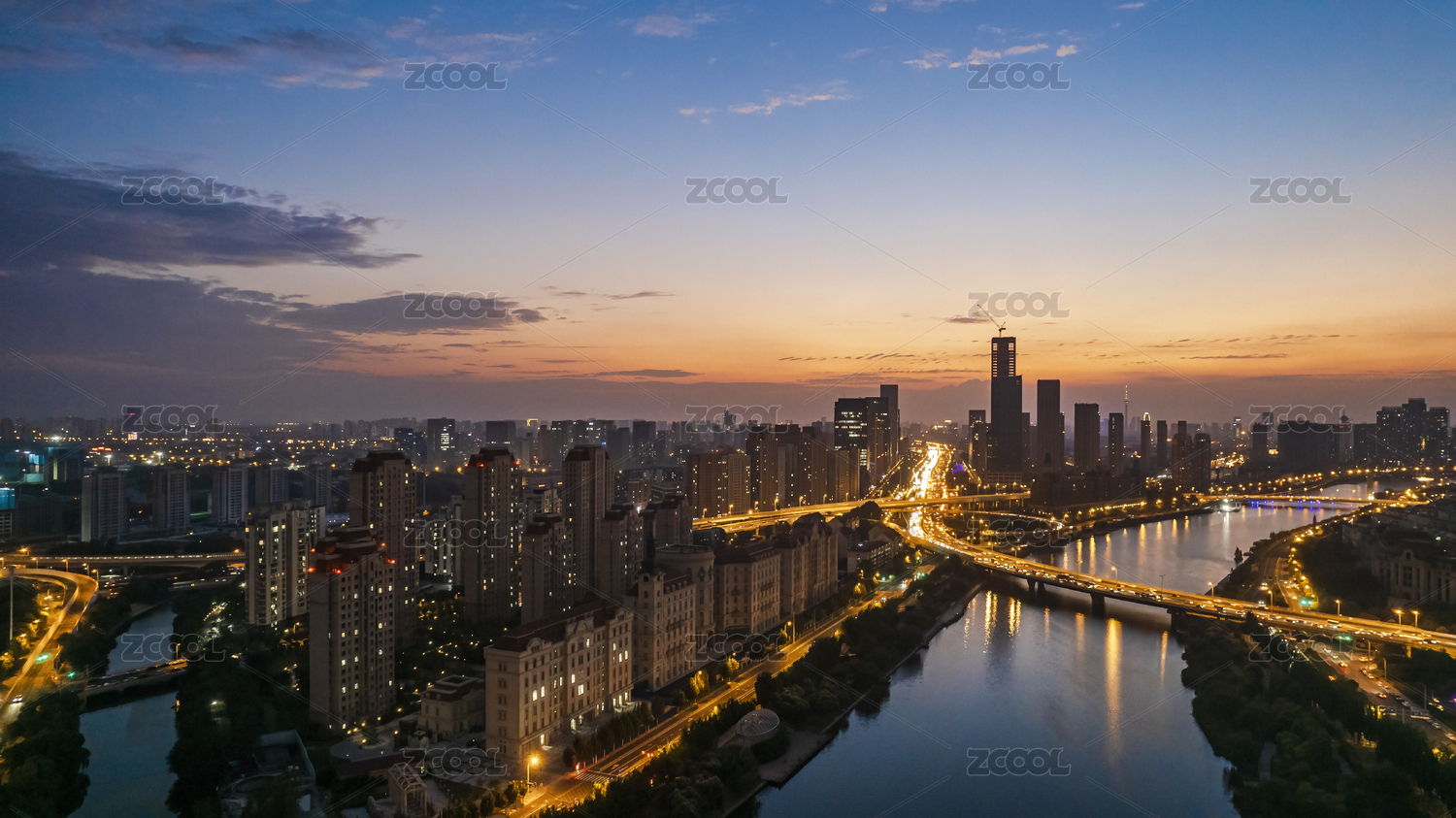 日落天津直沽桥海河沿岸城市建筑夜景航拍