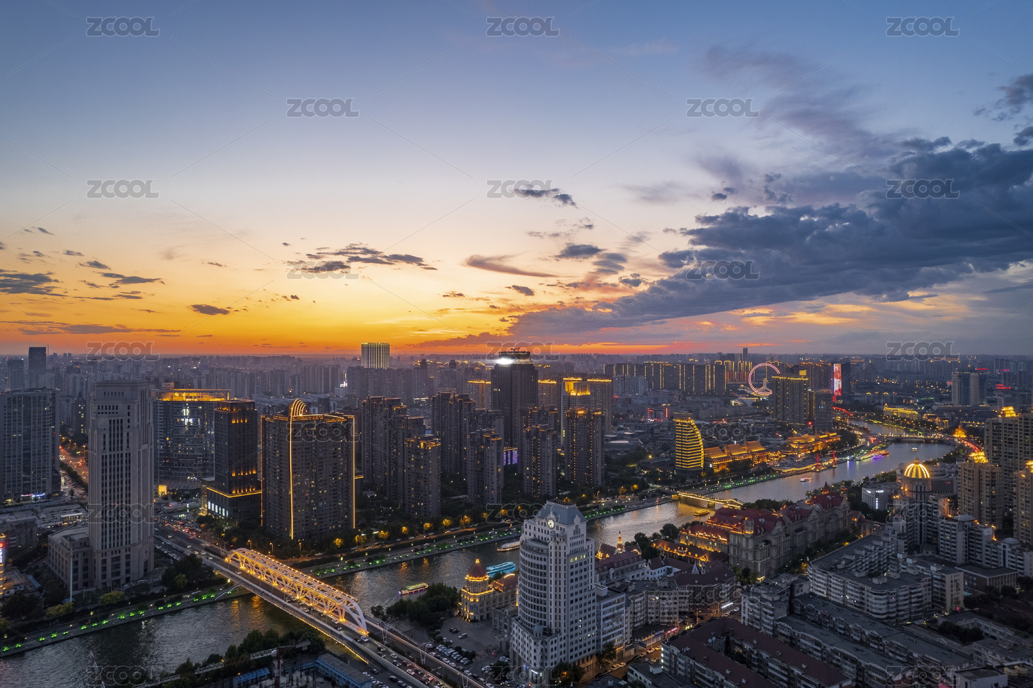 天津海河富民桥沿岸城市建筑日落风光航拍