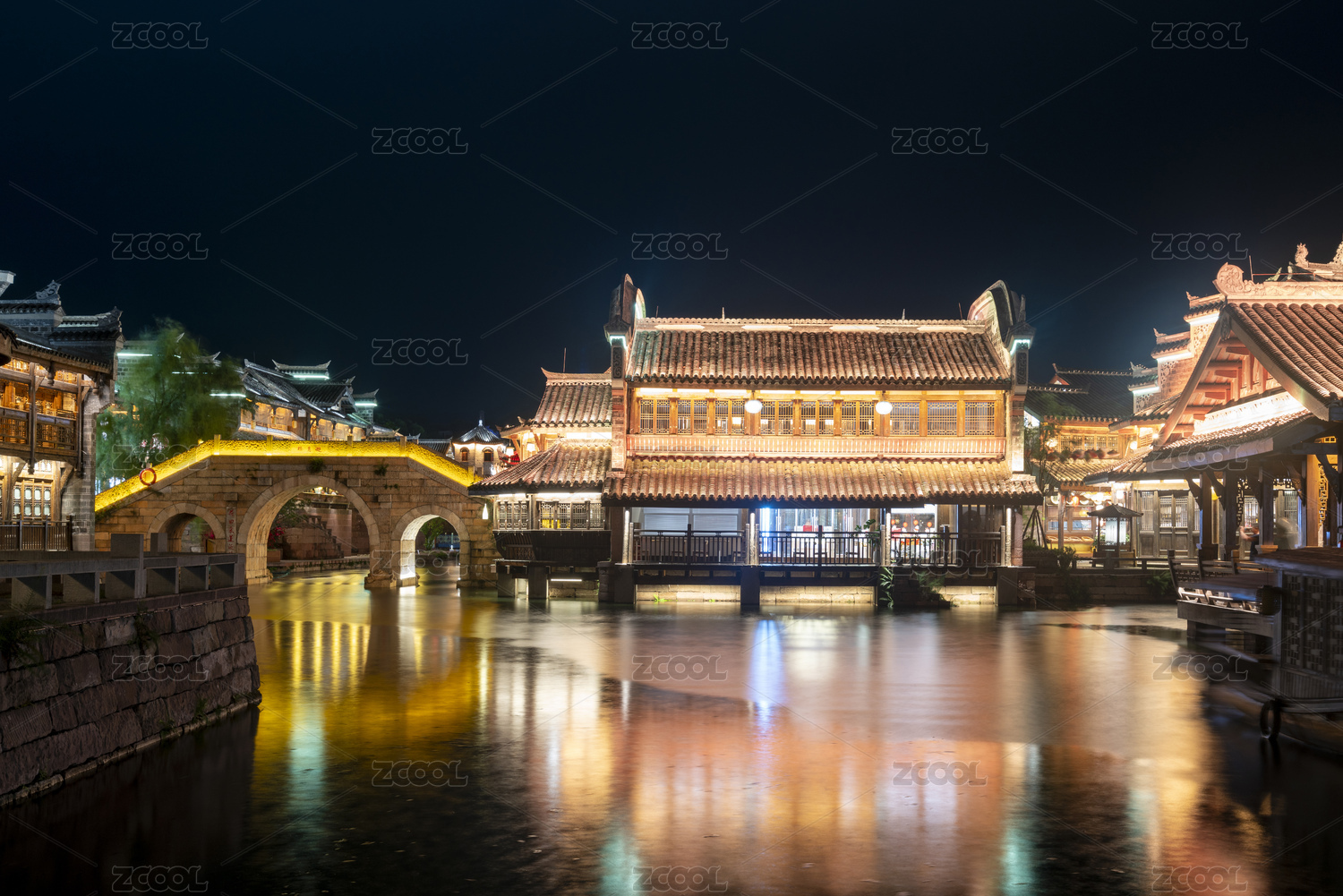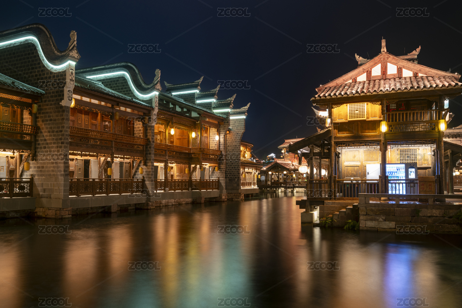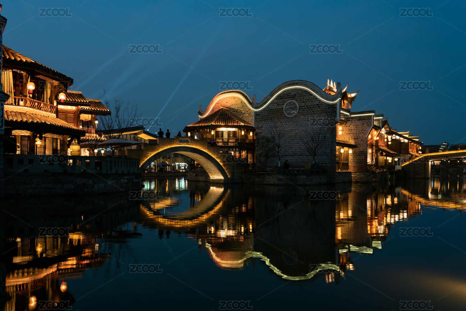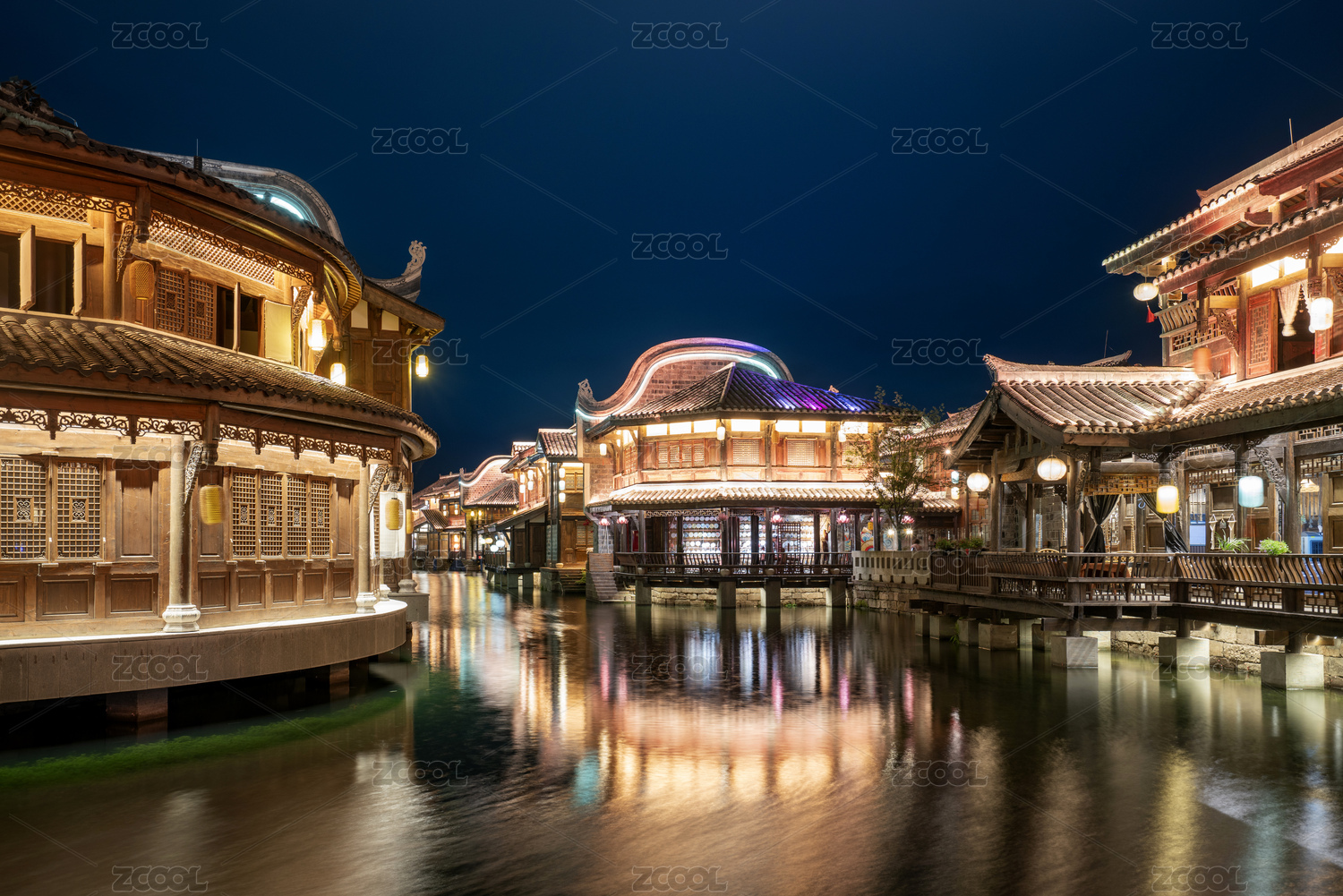 四川宜宾,李庄古镇,夜晚,夜景,古建筑,仿古建筑,亭台楼阁,灯光,拱桥,江南水乡