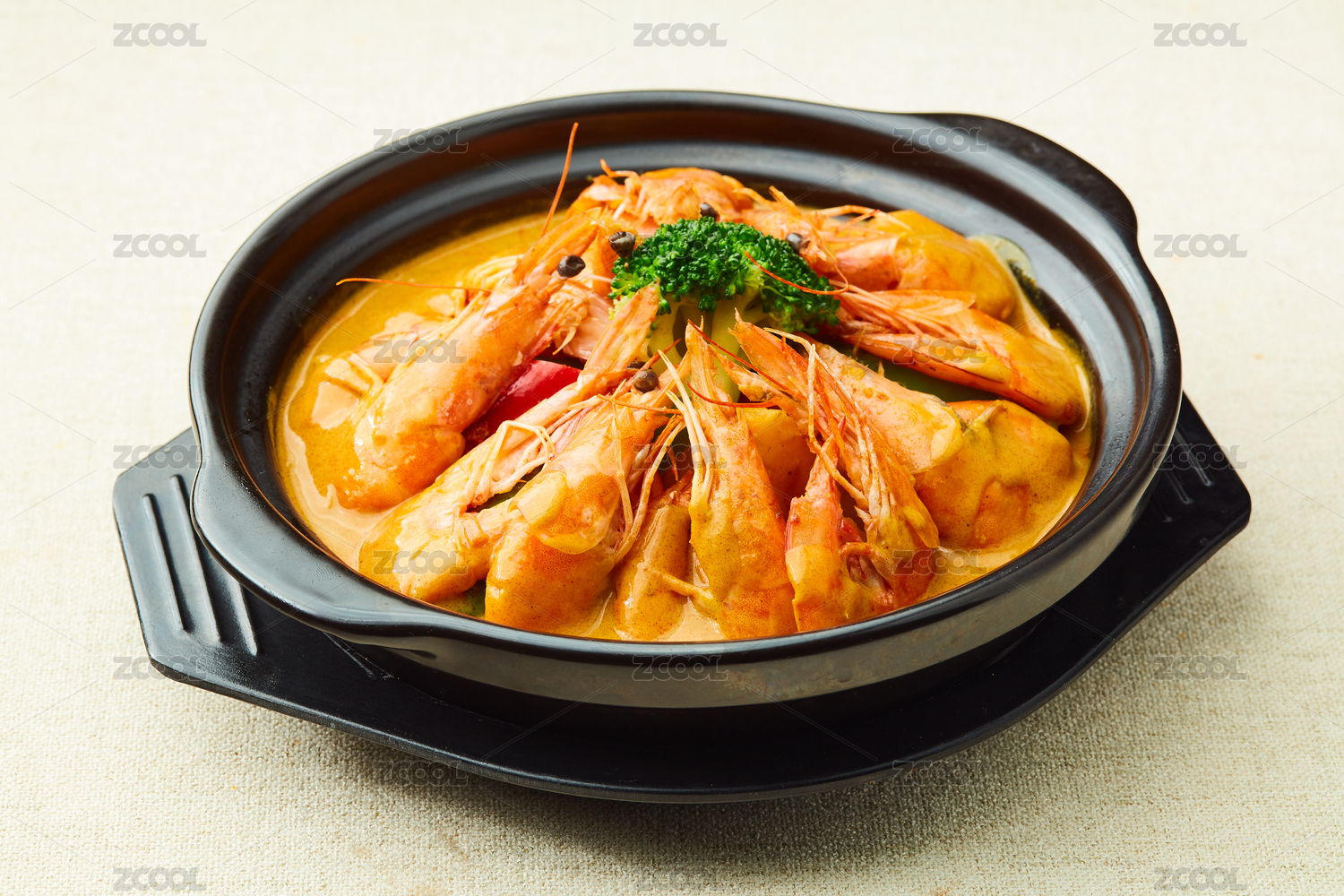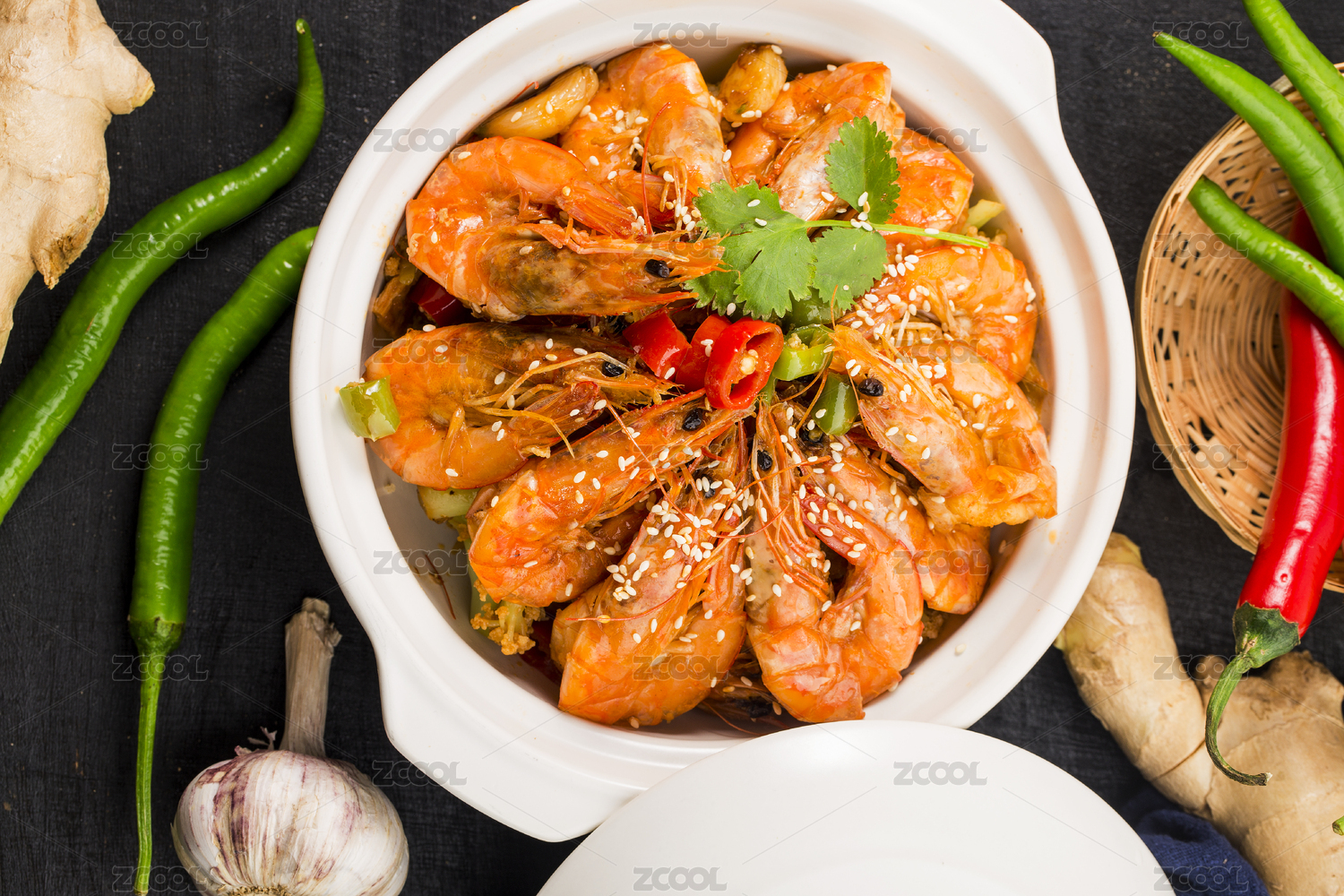 铁盆里的灯笼椒红油大虾鱿鱼须