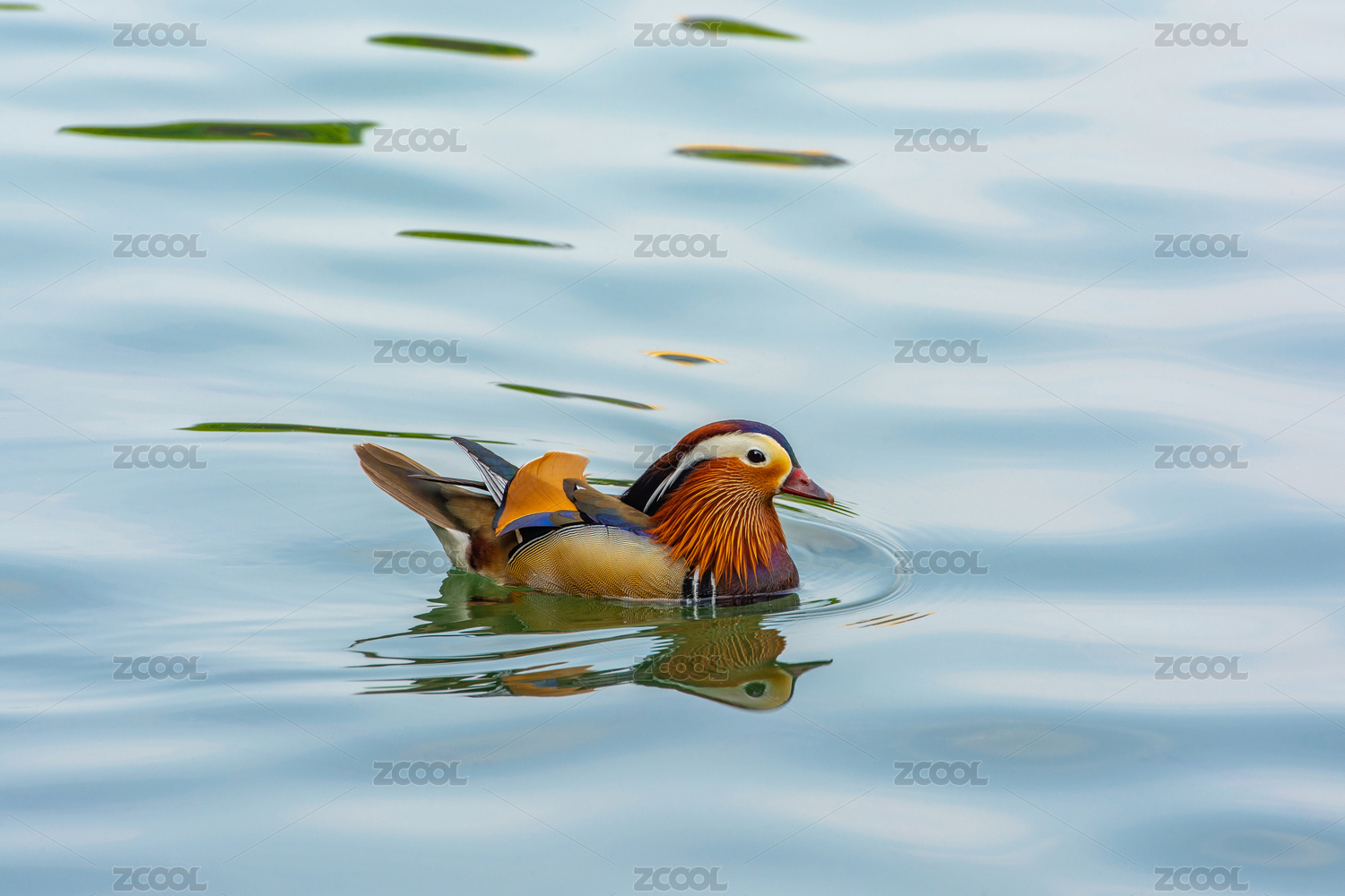 雅安龙苍沟水面上划水的彩色鸳鸯及倒影