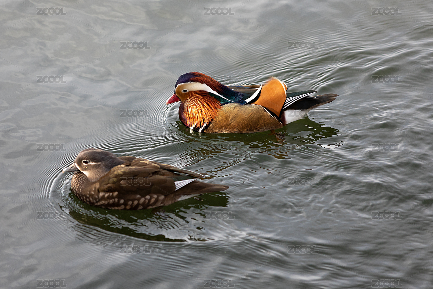 一对鸳鸯在波光粼粼的湖水中戏水嬉戏