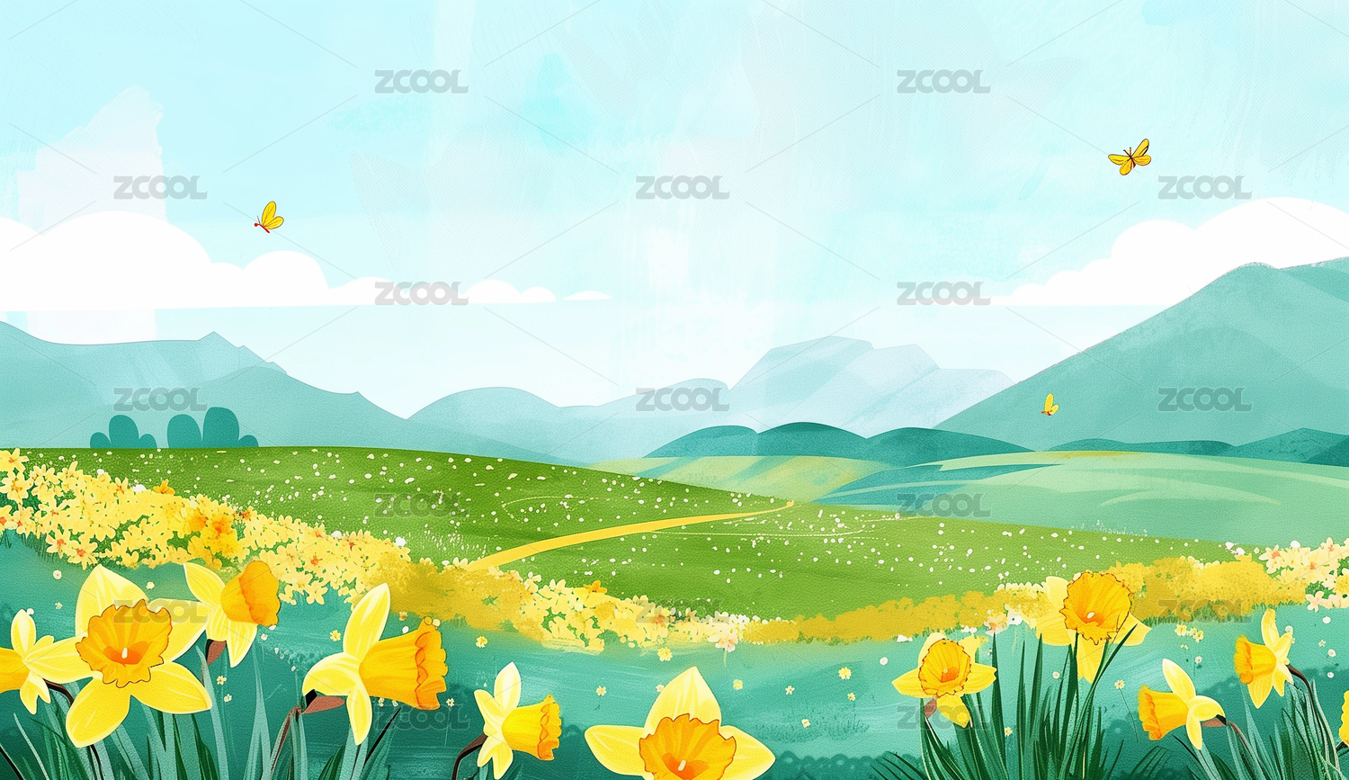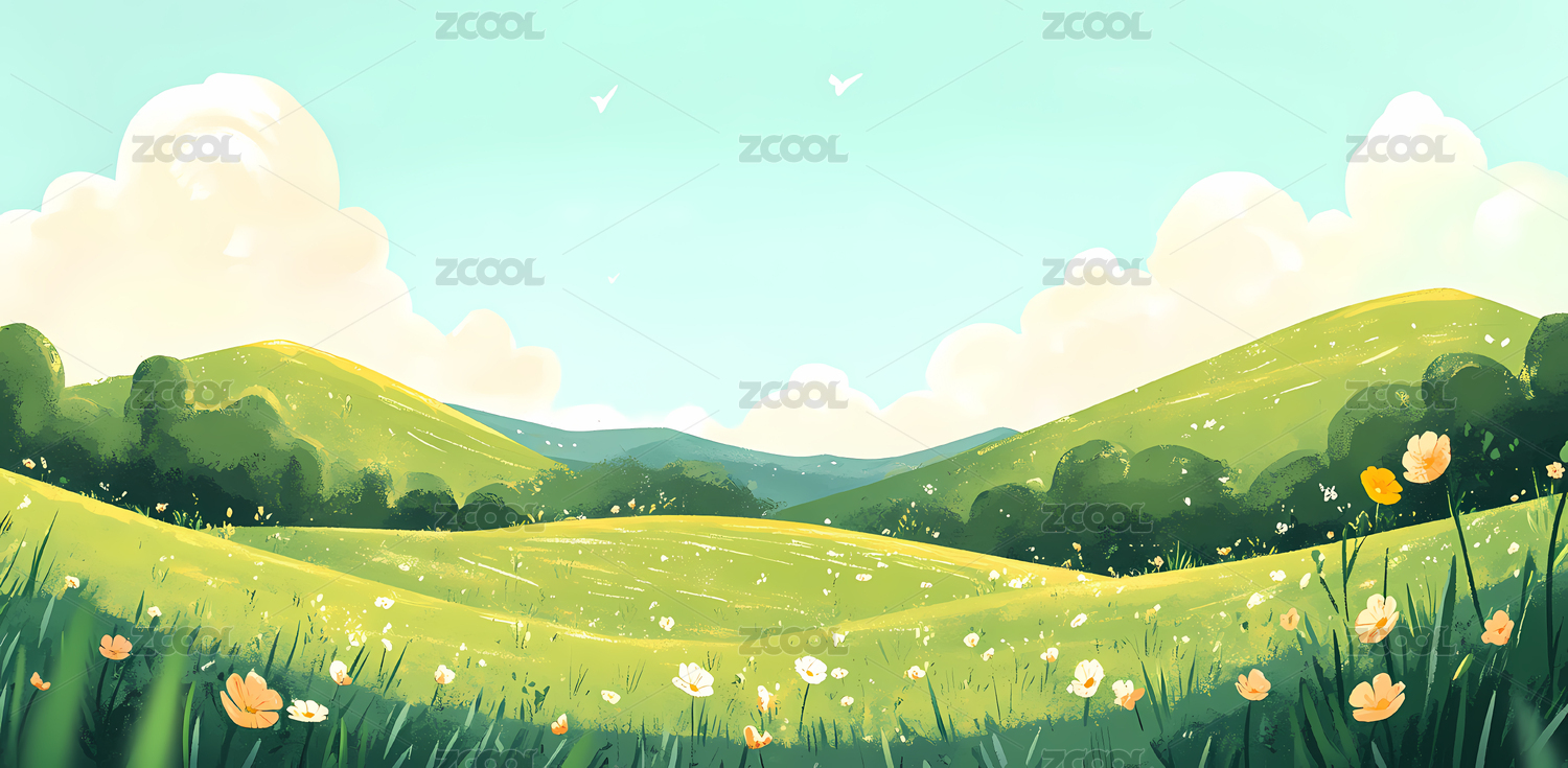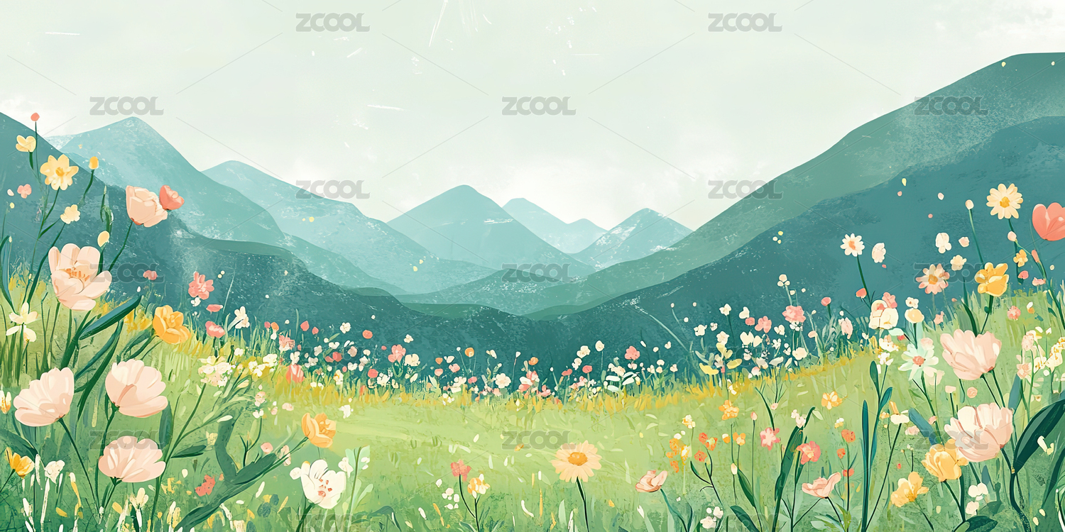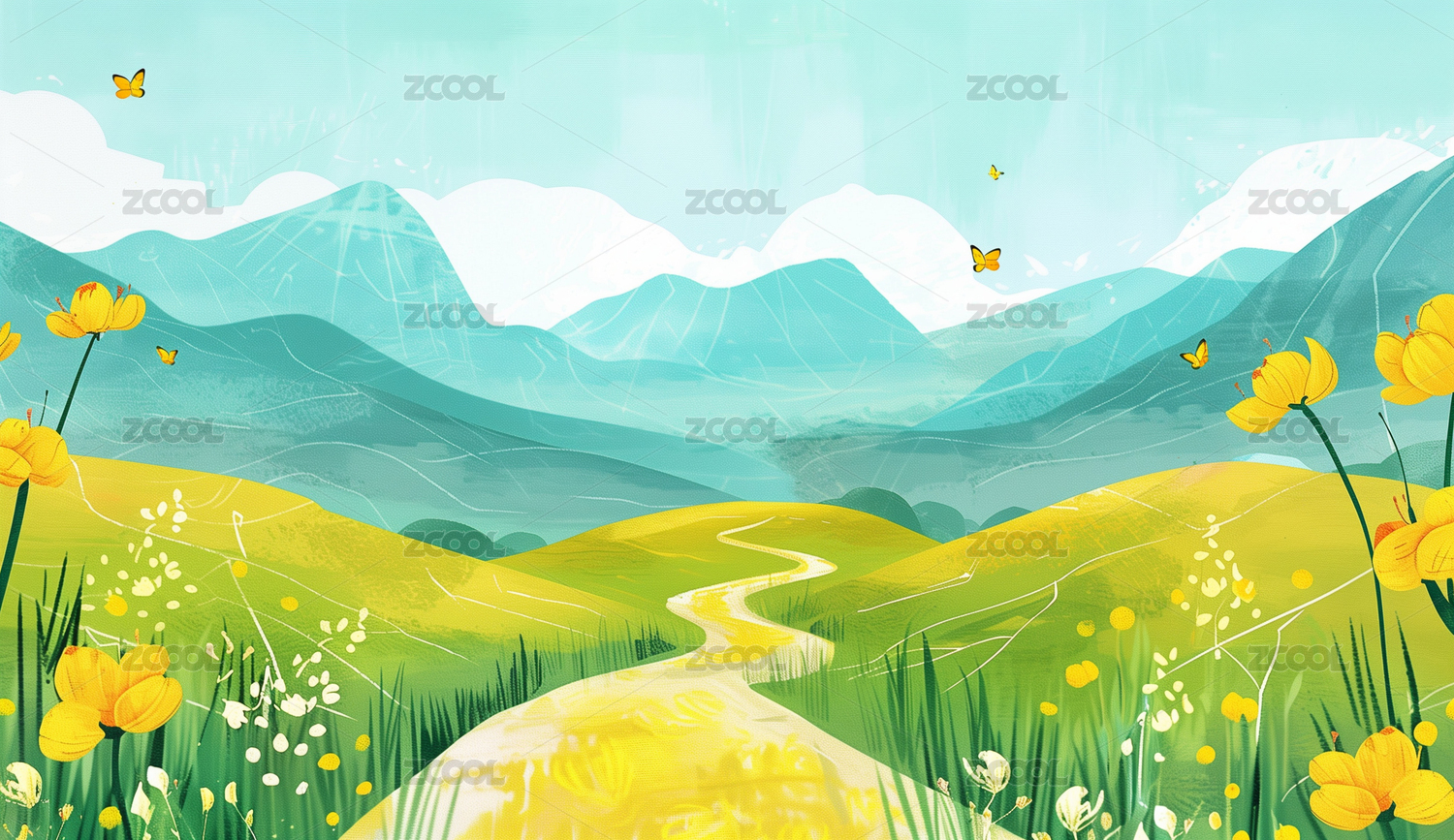 野花,草地,山,天空,插画,路,户外,风景,手绘