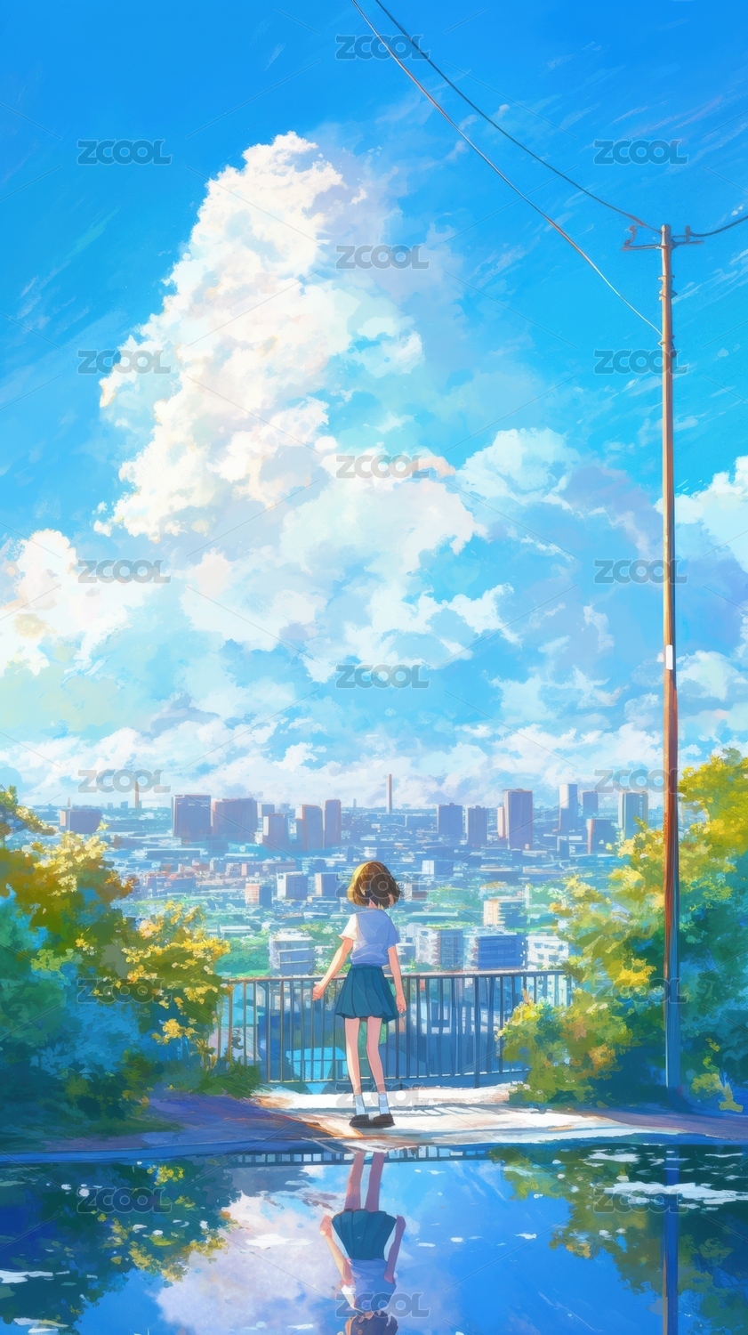 插画,唯美,建筑,女孩,云朵,天空,城市,晴空,眺望,动漫