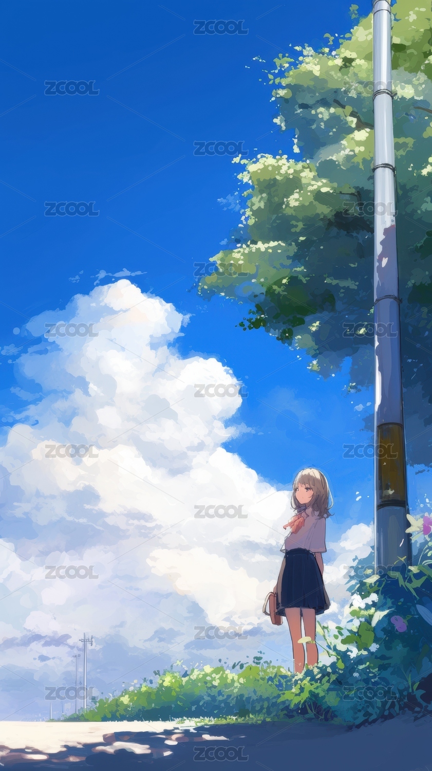 晴空下的树旁少女