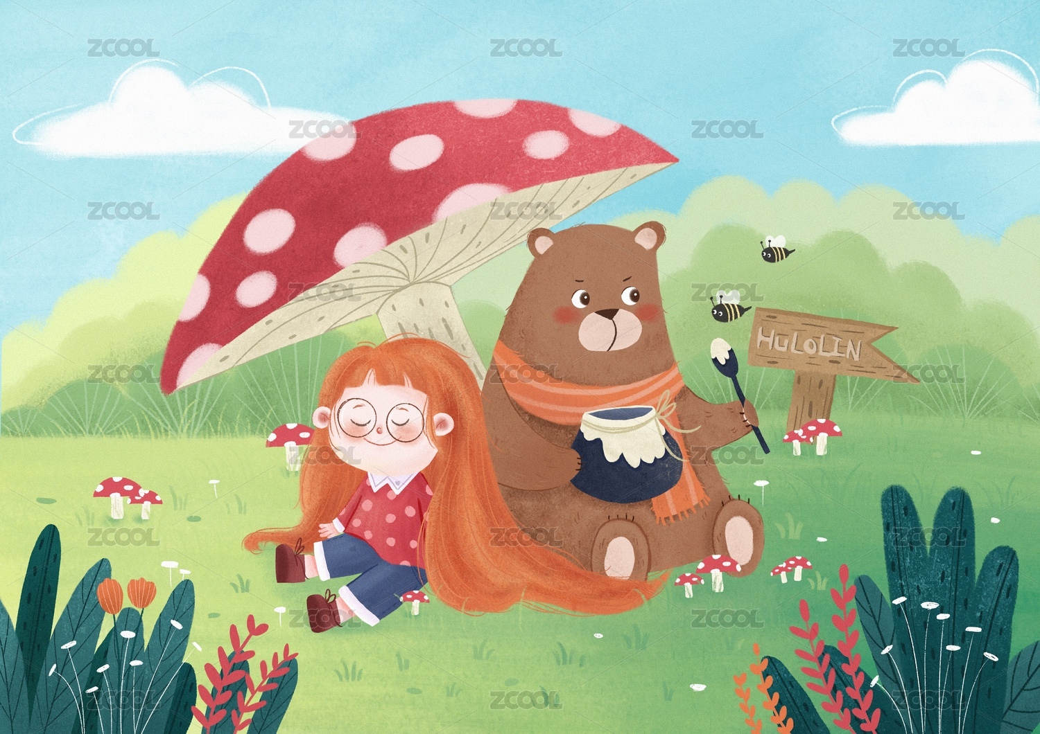 绘画,艺术,插图,儿童艺术,创造力,轻松熊,女孩,裙子,雨伞,森林