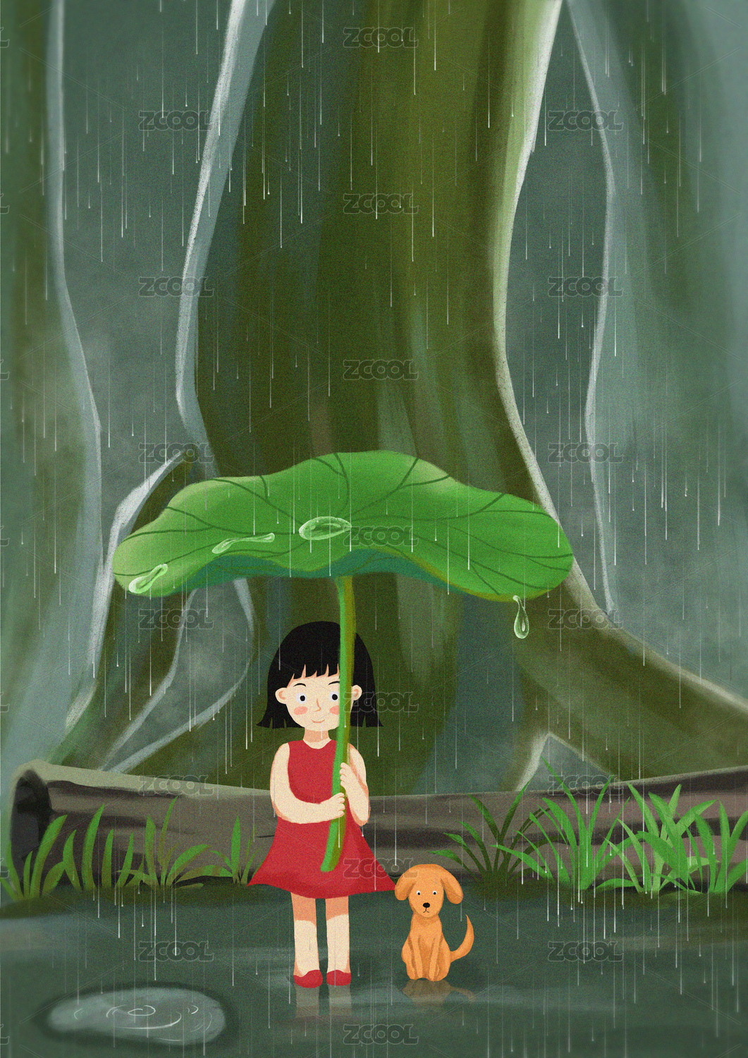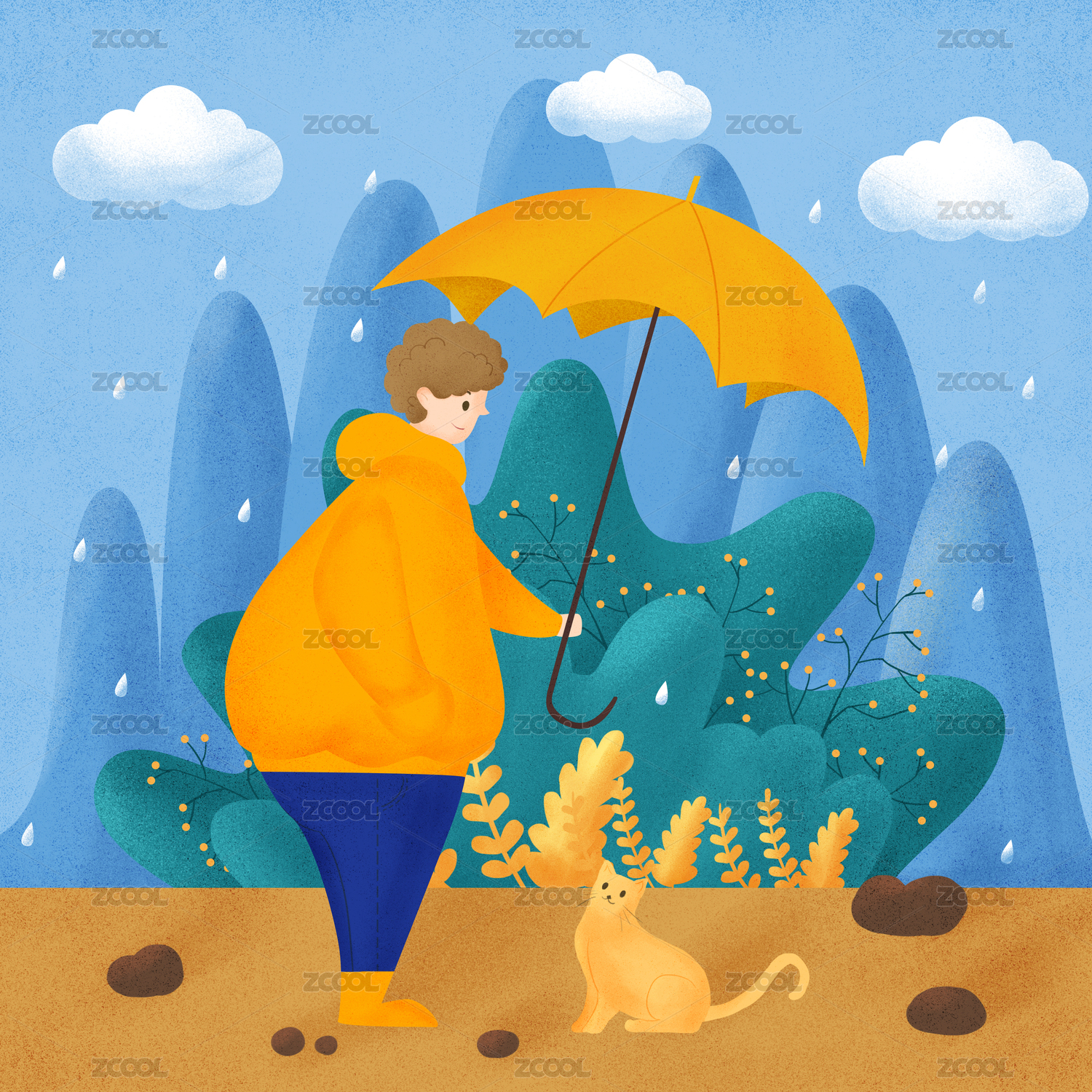 谷雨节气下雨时女孩和兔子蘑菇打伞漫步森林