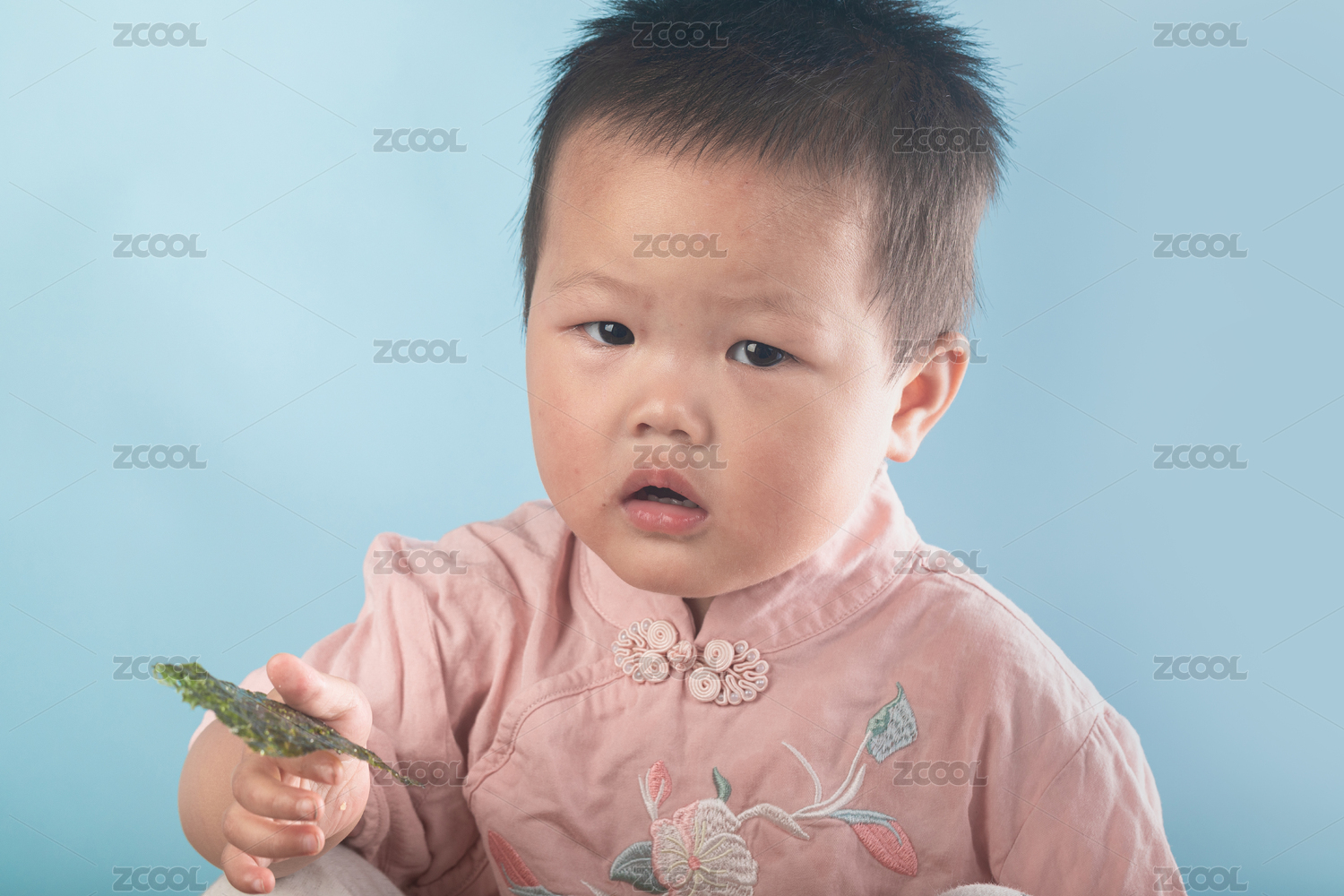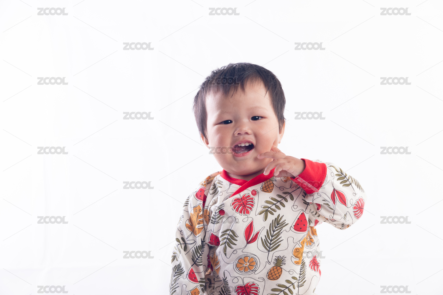 一百天大的宝宝一个人在纯白的背景里趴着玩