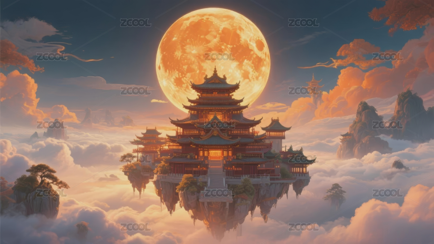 中国风亭台楼阁,飘渺夜景,中秋节背景