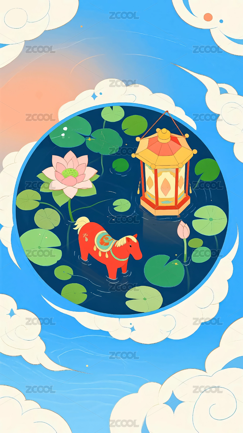 国潮风荷花荷叶风景手绘插画