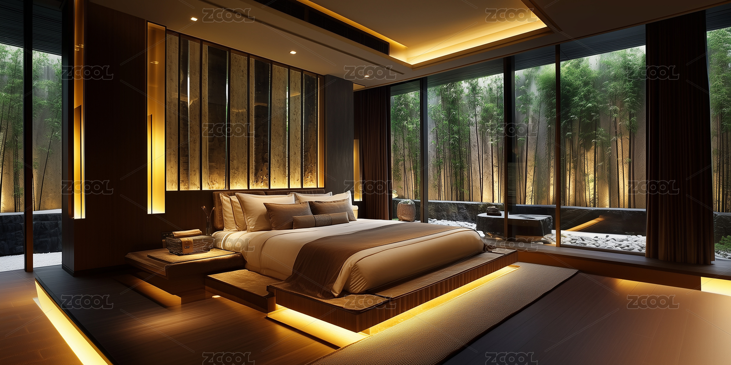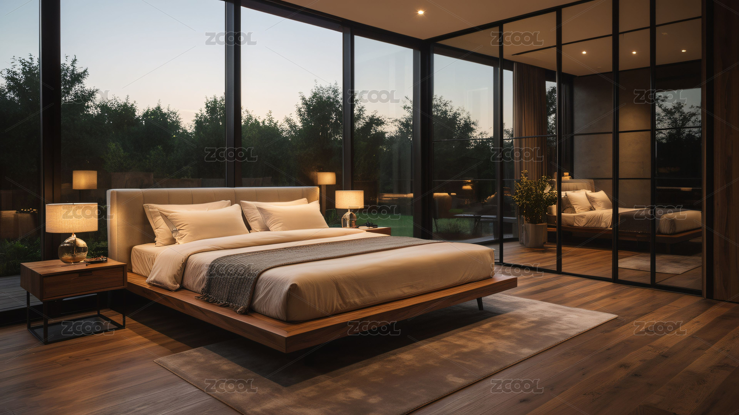 床,被子,枕头,窗户,植物,树叶,书籍,台灯,地毯,壁画