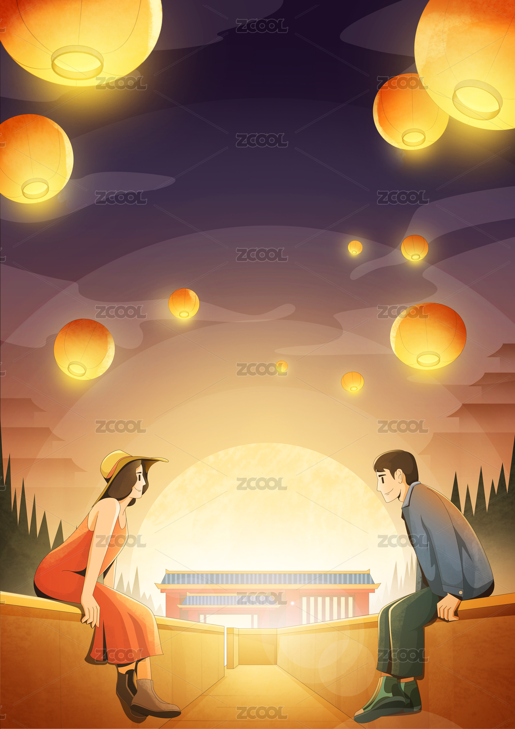 中秋七夕情侣月亮天灯夜晚手绘插画