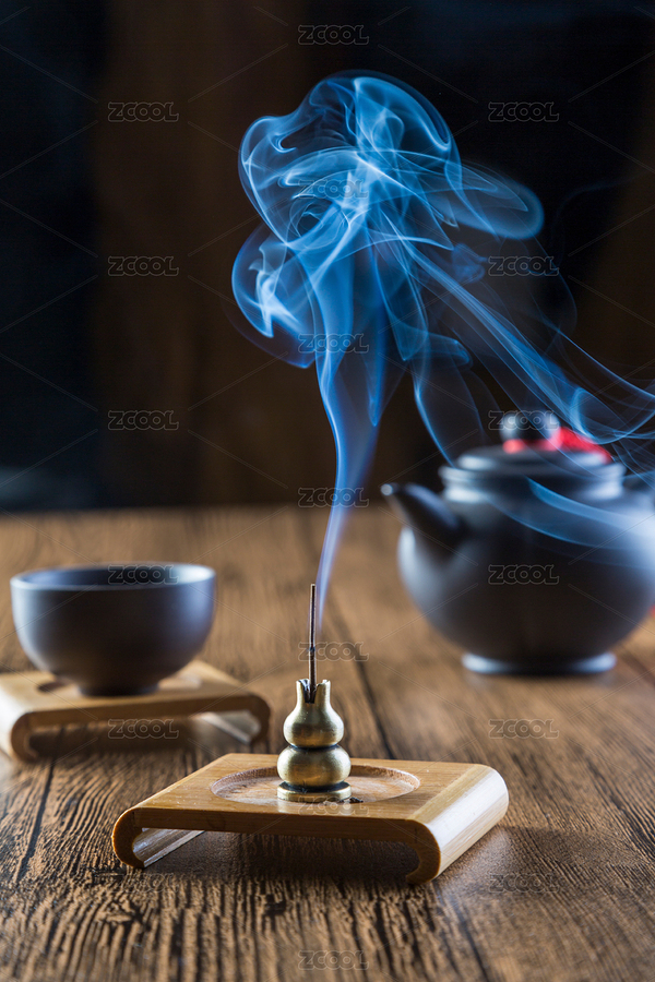 陶瓷茶具和袅袅飘散的沉香烟雾
