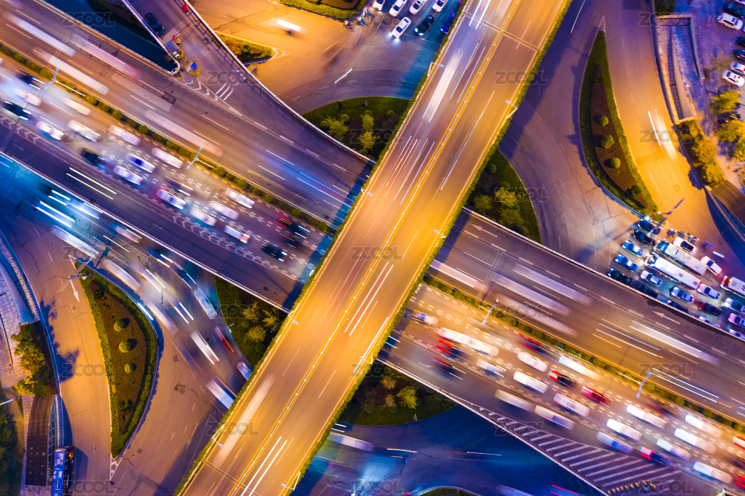 夜间汽车行驶的多层高速公路交叉口顶视图
