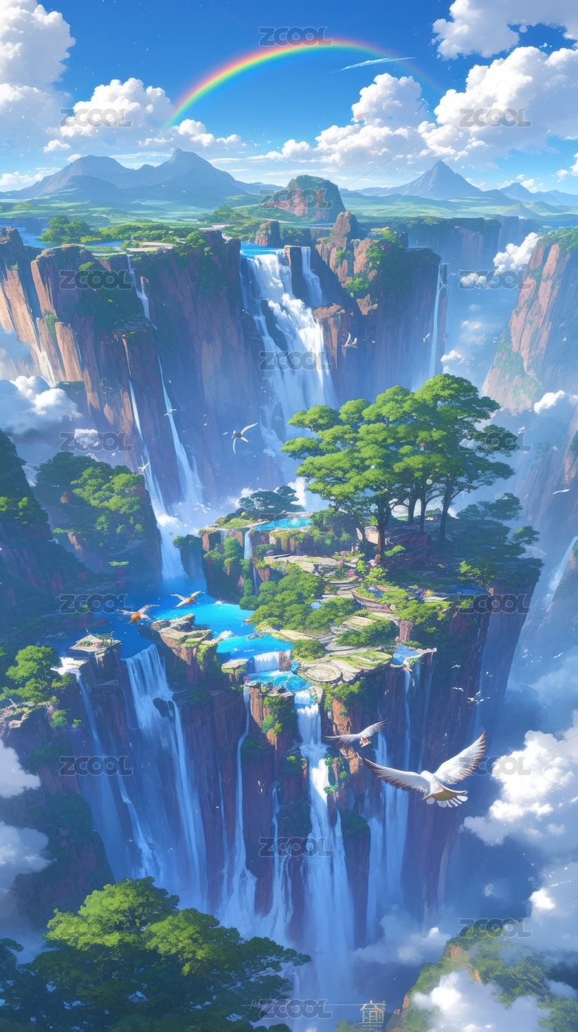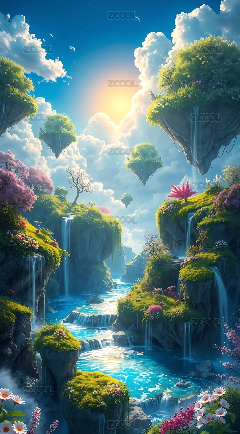 奇幻神话鲜花盛开的山间的五彩仙石3D插画