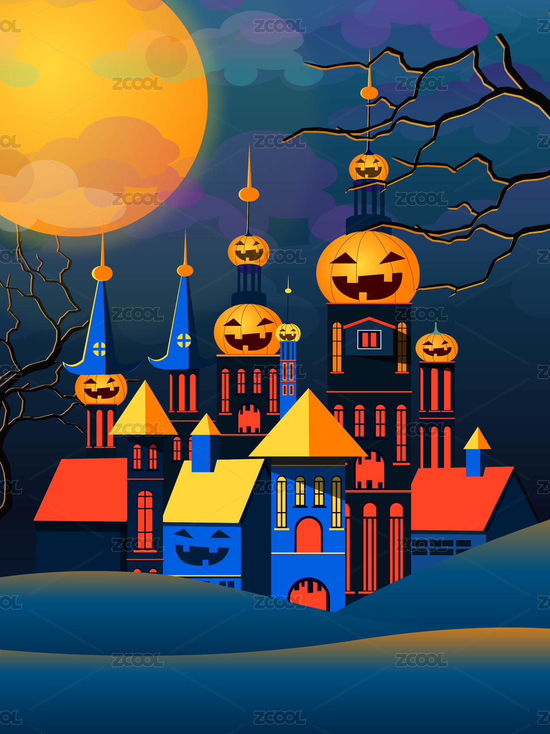 万圣节夜晚圆月下的南瓜城堡