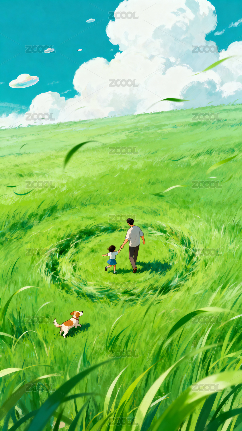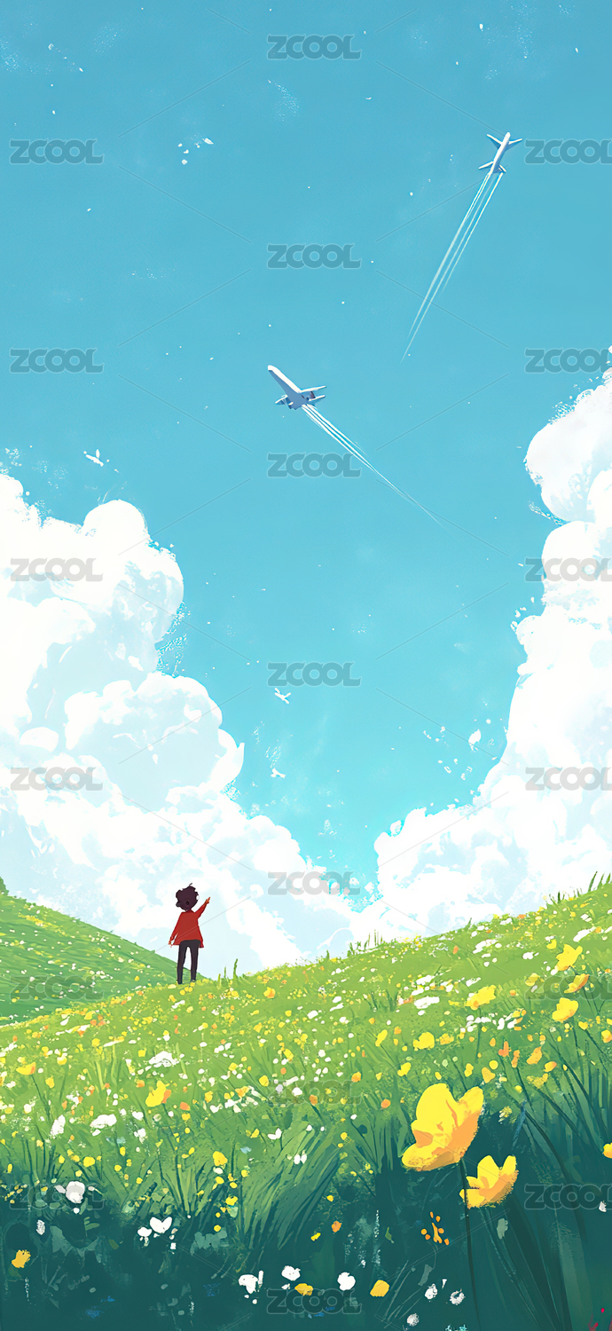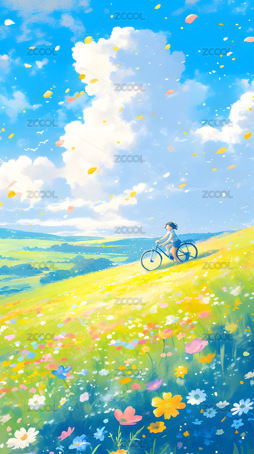一个儿童走在春天开满鲜花与绿草的山谷中