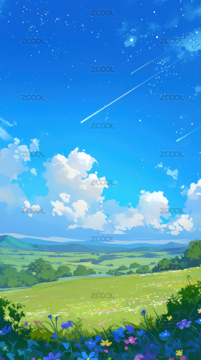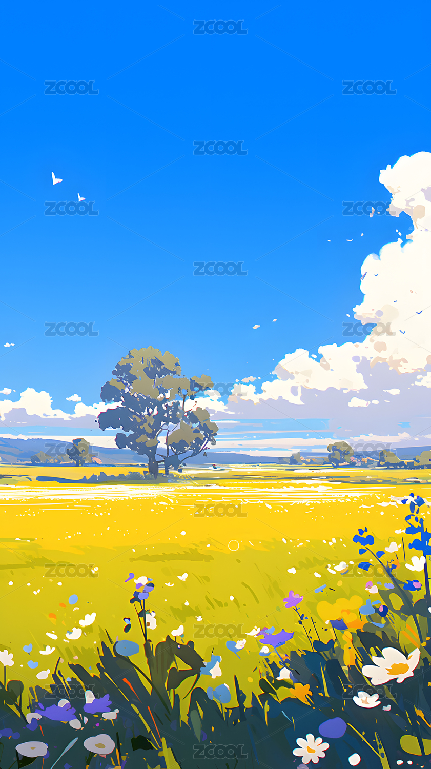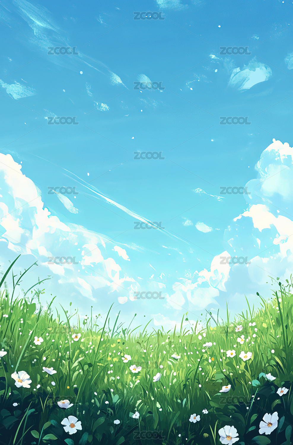 一个儿童走在春天开满鲜花与绿草的山谷中