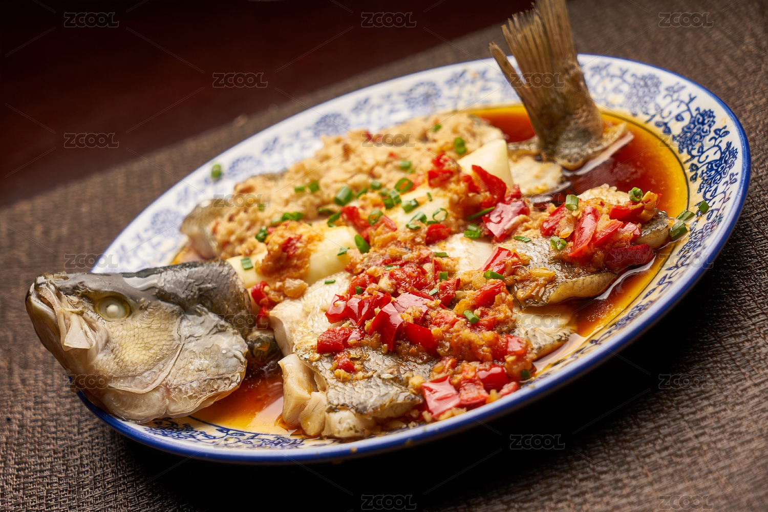 鲜美多汁的剁椒蒸鲈鱼盛放在瓷器盘子里