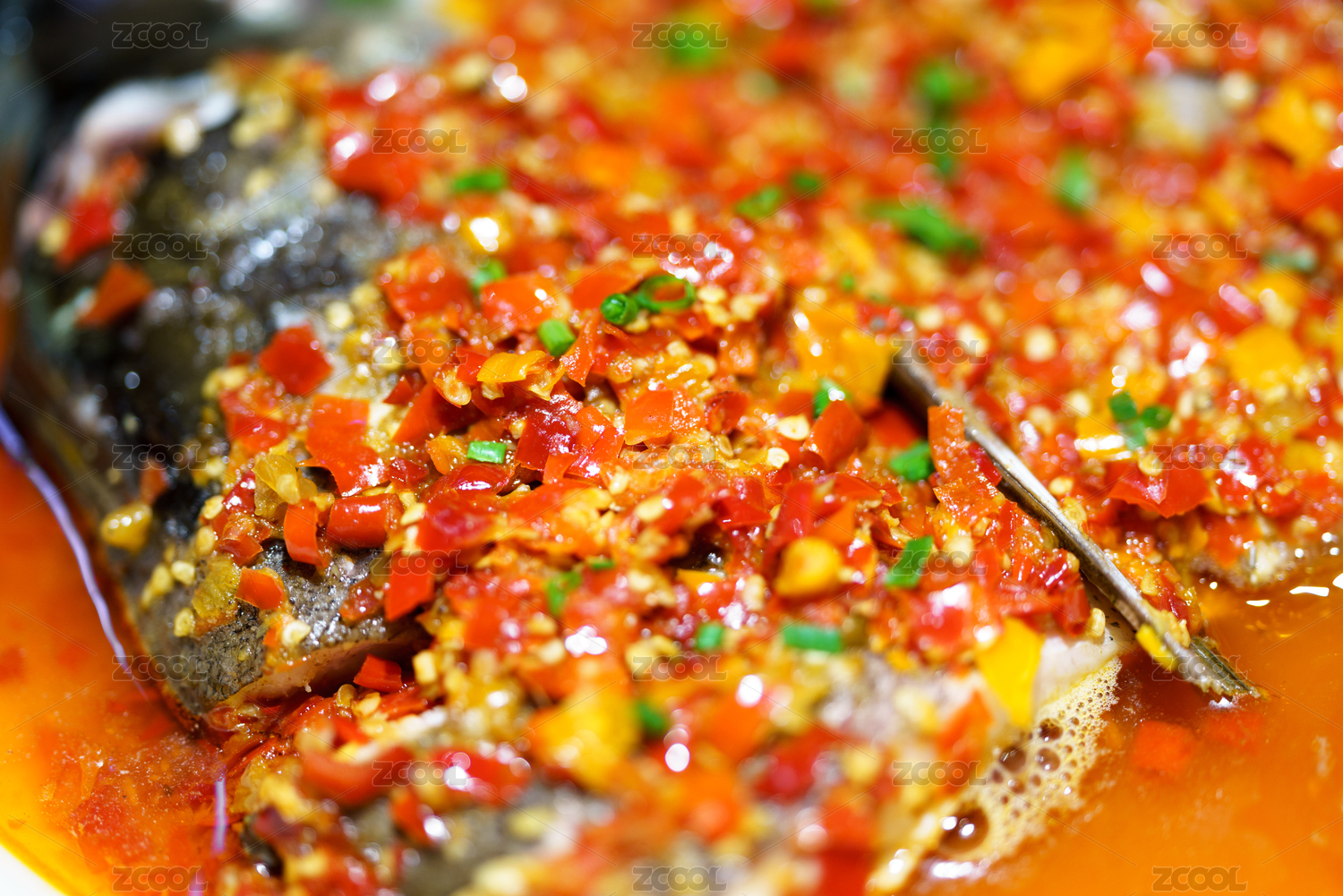 美味的农家菜剁椒鱼头盛放在白色的瓷盘里