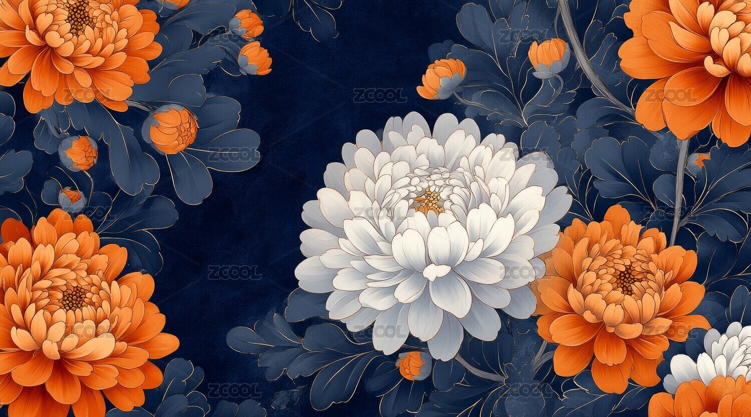 深蓝背景下的华丽菊花图案