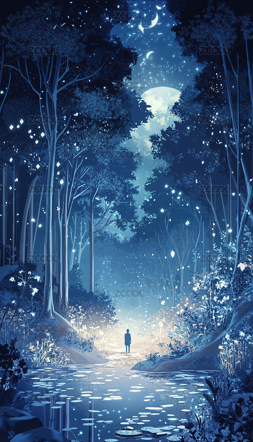 女孩萤火森林月光夜